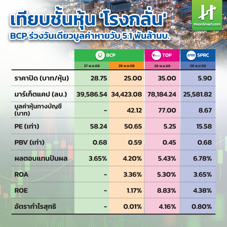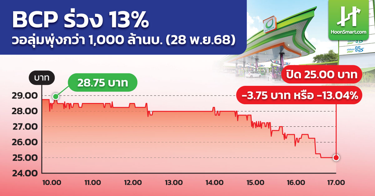HoonSmart.com>>หนีให้ทัน! 28 พ.ย. 2568 หุ้นบริษัท บางจาก คอร์ปอเรชั่น (BCP) มีการซื้อขายผิดปกติ ราคาหุ้นไหลลงจนมาปิดที่จุดต่ำสุด 25 บาท ร่วงลงถึง 3.75 บาท หรือ -13.04% ด้วยปริมาณมากกว่า 40.71 ล้านหุ้น มูลค่ารวมทั้งสิ้น 1,082.98 ล้านบาท กระโดดจากปกติเทรดไม่เกินวันละ 100 ล้านบาท ราคายังสวนทางหุ้นโรงกลั่น TOP,SPRC ท่ามกลางกระแสข่าว เรื่องผู้ถือหุ้นรายใหญ่เทกระจาดหุ้น จะเพื่อวัตถุประสงค์อะไรก็ตาม