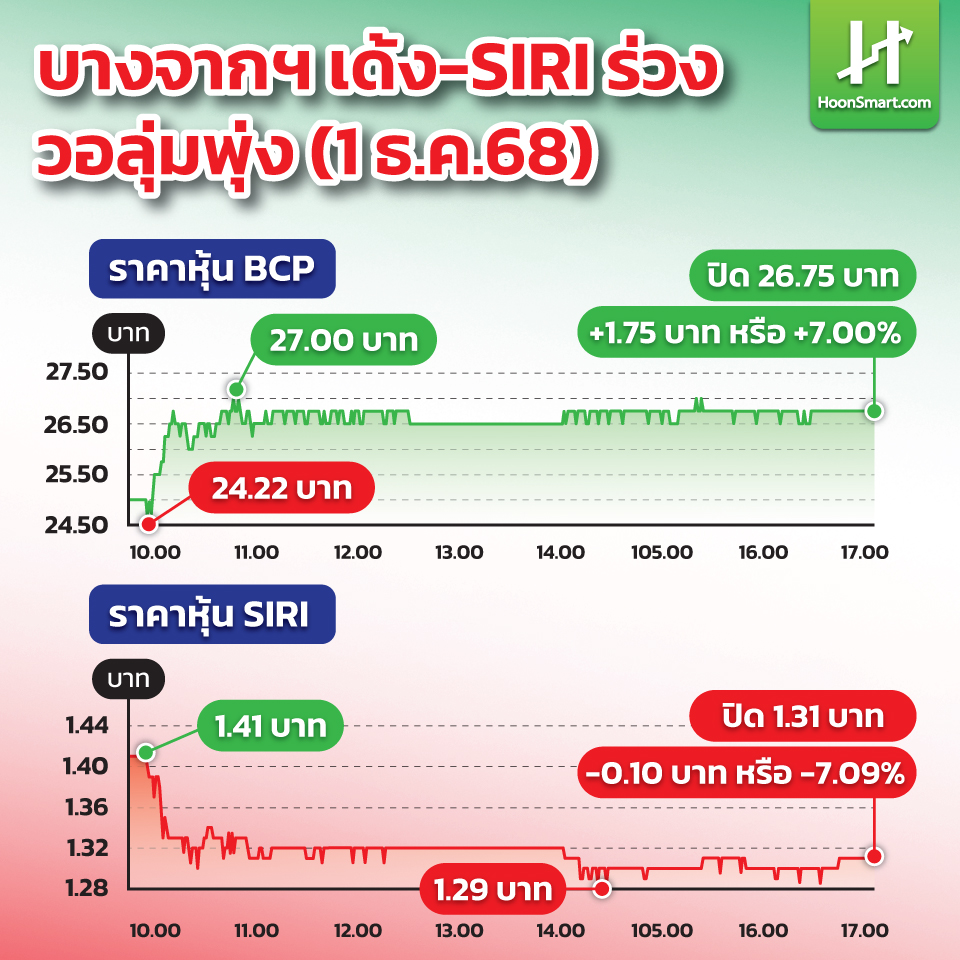 วันที่ 1 ธ.ค. 2568 หุ้นบริษัท บางจาก คอร์ปอเรชั่น (BCP) เปิดต่ำ 24.40 บาท ลงไปต่อแตะ 24.20 บาท ก่อนเด้งขึ้นแรง พุ่ง 7% ปิดที่ 26.75 บาท เพิ่มขึ้น 1.75 บาท มูลค่าซื้อขาย 557.60 ล้านบาท หลังจากวันศุกร์ที่ผ่านมาถูกถล่มยับราคาหุ้นดิ่ง 13% ด้วยมูลค่าการซื้อขายมากผิดปกติกว่า 1,000 ล้านบาท ทั้งนี้มีกระแสข่าวว่า ผู้ถือหุ้นใหญ่เทกระจาดหุ้น หลังจากมีการตรวจสอบการซื้อขายหุ้นทั้งหมด 7 บริษัท รวมถึง BCP และ SIRI ปิดที่ 1.31 บาท ลดลง -0.10 บาทหรือ -7.09% มูลค่าซื้อขาย 624.93 ล้านบาท ขณะที่ VGI ปิดเท่ากับวันก่อน 1.08 บาท