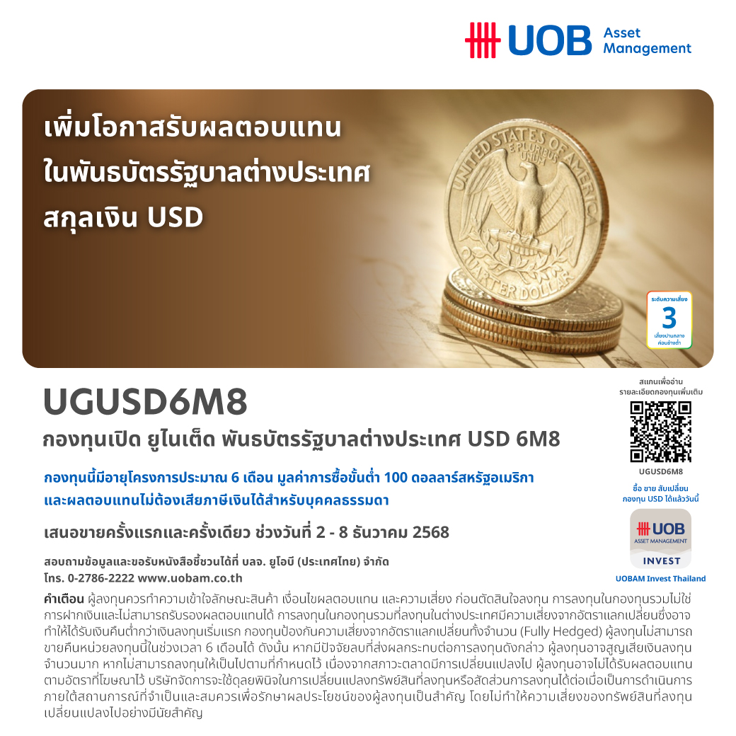 บริษัทหลักทรัพย์จัดการกองทุน (บลจ.) ยูโอบี (ประเทศไทย) จำกัด หรือ UOBAM ได้เสนอขายหน่วยลงทุนครั้งแรก (IPO) กองทุนเปิด ยูไนเต็ด พันธบัตรรัฐบาลต่างประเทศ USD 6M8 (UGUSD6M8) อายุประมาณ 6 เดือน ประมาณการผลตอบแทน 3.45% ต่อปี (ข้อมูลจากอัตราผลตอบแทนที่เสนอโดยผู้ออกตราสาร หรือจากผู้ขาย ณ วันที่ 27 พฤศจิกายน 2568) กองทุนมีขนาดโครงการ 200 ล้านดอลลาร์สหรัฐ โดยเสนอขายในราคา 10 ดอลลาร์สหรัฐต่อหน่วย และยอดลงทุนครั้งแรกขั้นต่ำ 100 ดอลลาร์สหรัฐ