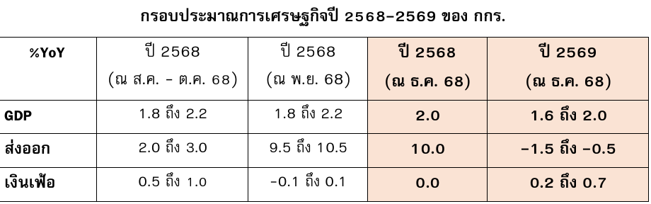 ปัจจัยภายในประเทศ อุทกภัยครั้งใหญ่ในภาคใต้ สร้างความเสียหายต่อชีวิตและทรัพย์สินของประชาชนอย่างรุนแรง บางพื้นที่ถูกจัดเป็นสาธารณภัยระดับ 4 เทียบเคียงกับสึนามิปี 2547 ความเสียหายรวมหลายแสนล้านบาท โดยในเดือนธ.ค. 2568 เพียงเดือนเดียว สูญเสียรายได้ราว 2–3 หมื่นล้านบาท หรือคิดเป็น 0.1–0.2% ของ GDP ทำให้เศรษฐกิจไทยทั้งปีขยายตัวเพียง 2.0% และคาดว่าปี 2569 จะสูญเสียรายได้เพิ่มขึ้นถึง 9 หมื่นล้านบาท