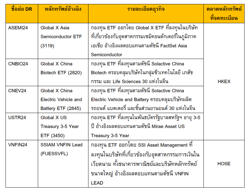 ตลาดหลักทรัพย์แห่งประเทศไทย รับจดทะเบียนตราสารแสดงสิทธิในหลักทรัพย์ต่างประเทศ (DR) 5 หลักทรัพย์ใหม่ อ้างอิงกองทุน ETF ที่จดทะเบียนในตลาดหลักทรัพย์ฮ่องกง (HKEX) 4 กองทุน และตลาดหลักทรัพย์นครโฮจิมินห์ (HOSE) ประเทศเวียดนาม 1 กองทุน ออกโดย บริษัทหลักทรัพย์ ฟินันเซีย ไซรัส จำกัด (มหาชน) (FSS) เริ่มซื้อขายในตลาดหลักทรัพย์ไทย 9 ธันวาคม 2568