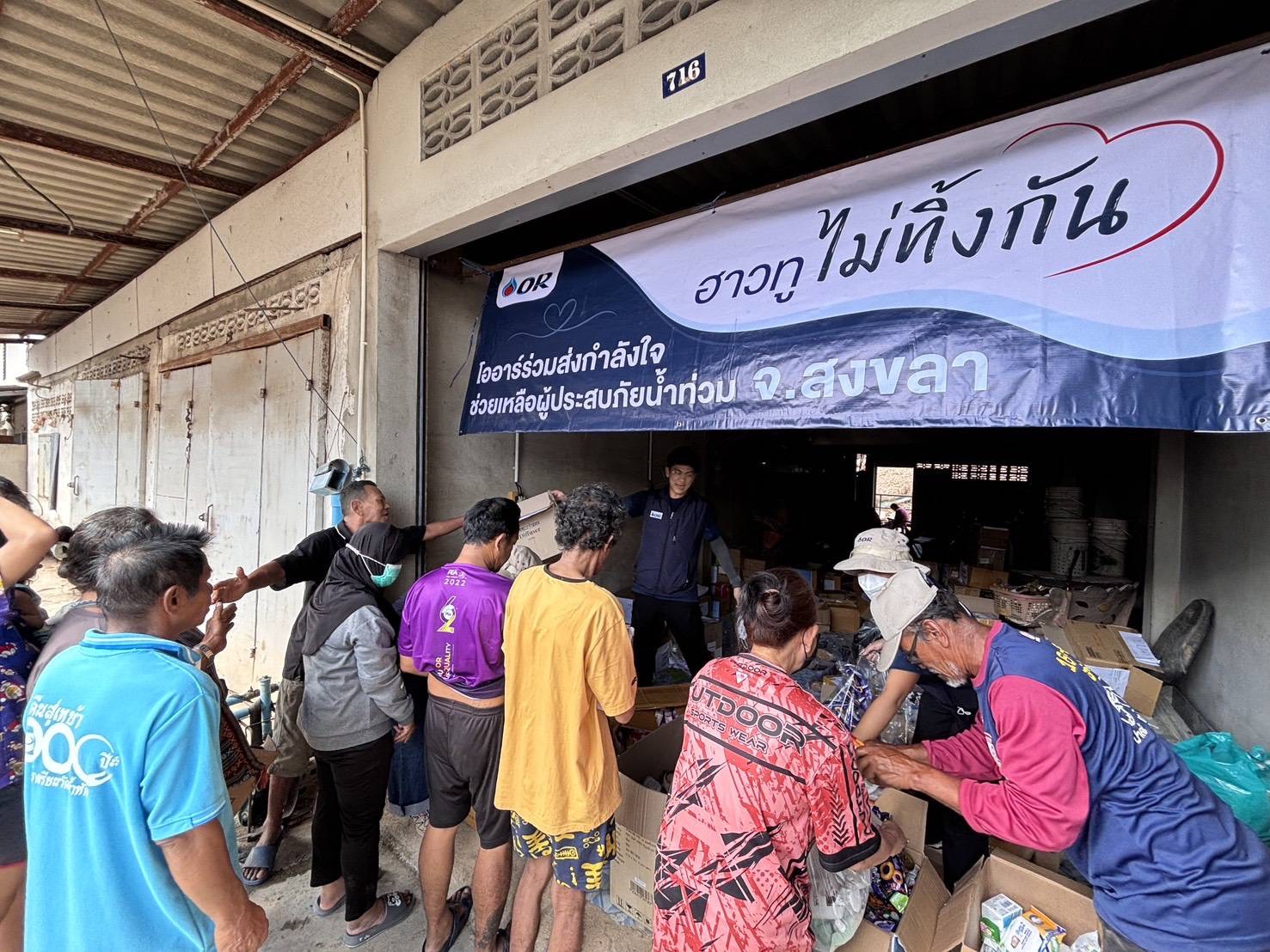 หม่อมหลวงปีกทอง ทองใหญ่ ประธานเจ้าหน้าที่บริหาร บริษัท ปตท. น้ำมันและการค้าปลีก จำกัด (มหาชน) (OR) พร้อมด้วยผู้บริหารและพนักงาน ร่วมส่งมอบของบริจาค เครื่องอุปโภค สิ่งของที่จำเป็น อาทิ เสื้อผ้า รองเท้า เครื่องนอน อาหาร ซึ่งรับบริจาคผ่านโครงการ “ฮาวทูไม่ทิ้งกัน” เพื่อส่งต่อไปยังศูนย์อพยพและศูนย์พักพิงในจังหวัดสงขลาสนับสนุนการดำเนินงานของเจ้าหน้าที่ ตลอดจนมอบให้แก่ผู้ประสบอุทกภัยได้ใช้ประโยชน์ โดยจะนำส่งไปยัง สาธารณสุขอำเภอหาดใหญ่ ที่ว่าการอำเภอหาดใหญ่ และชุมชนสะพานดำ ในโอกาสนี้ ร้าน found&found ร้านค้าปลีกสุขภาพและความงามในเครือ OR ยังได้ร่วมบริจาคสิ่งของเครื่องใช้จำเป็นในชีวิตประจำวันอีกด้วย