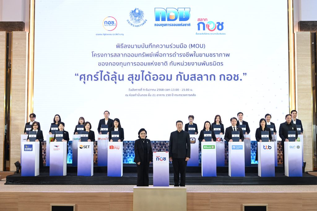 HoonSmart.com>> กองทุนการออมแห่งชาติ (กอช.) บันทึกความร่วมมือ (MOU) โครงการสลากออมทรัพย์เพื่อการดำรงชีพในยามชราภาพของกองทุนการออมแห่งชาติ กับหน่วยงานพันธมิตร “ศุกร์ได้ลุ้น สุขได้ออม กับสลาก กอช.” เพื่อยกระดับการออมของคนไทยเข้าสู่การออมผ่านดิจิทัล ที่สะดวก รวดเร็ว ครอบคลุมทุกช่องทาง ทุกพื้นที่ พร้อมลุ้นรางวัลใหญ่ 1 ล้านบาททุกสัปดาห์ พร้อมเปิดตัวแอปพลิเคชัน กอช.รูปแบบใหม่ ทำธุรกรรม เปิดบัญชี ติดตามเงินออม ข้อมูลข่าวสารของสมาชิก กอช. รวมถึงการจำหน่ายสลาก กอช.ในอนาคต