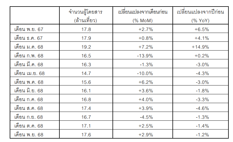 HoonSmart.com>>กองทุนโครงสร้างพื้นฐาน BTSGIF เผยจำนวนผู้โดยสารรถไฟฟ้า BTS (ส่วนหลัก สถานีหมอชิต – อ่อนนุชและสถานีสนามกีฬาแห่งชาติ – สะพานตากสิน) เดือนพ.ย.68 รวมจำนวน 17.6 ล้านเที่ยว เพิ่มขึ้น 2.9% จากต.ค. แต่ลดลง 12% จากพ.ย.ปีก่อน