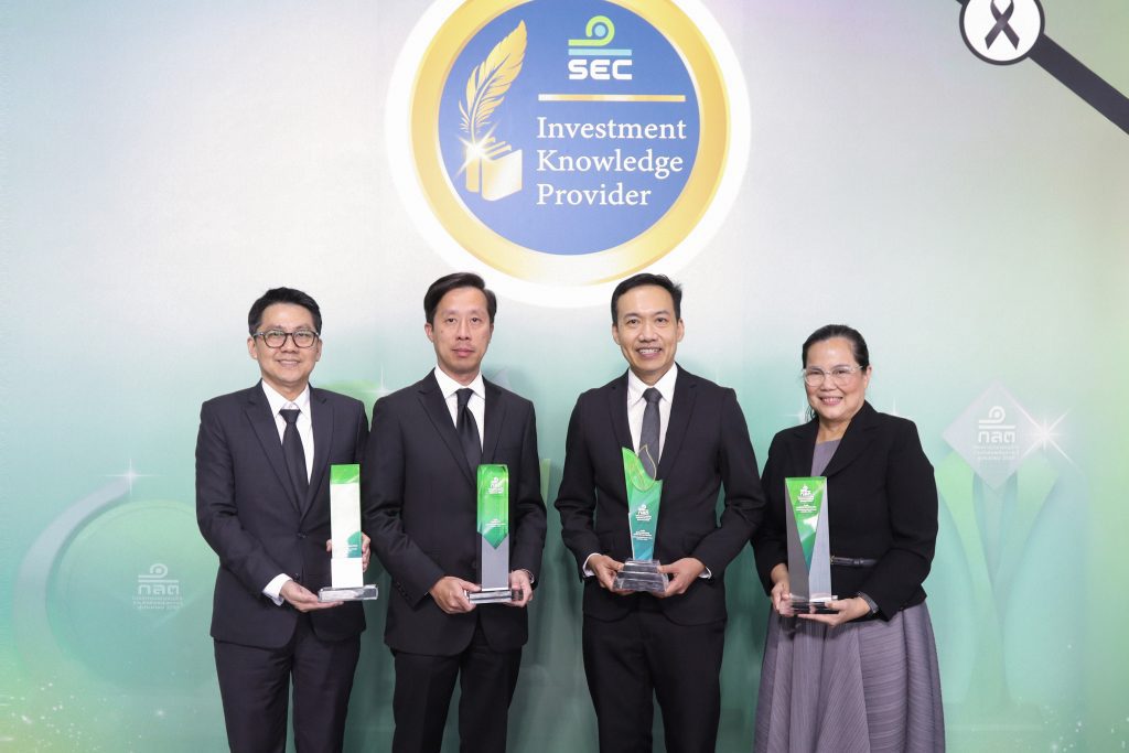 บริษัทหลักทรัพย์จัดการกองทุน (บลจ.)กสิกรไทย จำกัด คว้าครบทั้ง 4 รางวัล ในงานพิธีมอบรางวัลโครงการ “ตลาดทุนไทย ร่วมใจส่งพลังความรู้ สู่ประชาชน ปี 2568” จัดโดยสำนักงานคณะกรรมการกำกับหลักทรัพย์และตลาดหลักทรัพย์ (ก.ล.ต.) ได้แก่ รางวัลขวัญใจมหาชน (Public Favorite Award), รางวัลการสร้างองค์ความรู้อย่างยั่งยืน (Sustainability Award), รางวัลความคิดสร้างสรรค์ยอดเยี่ยม (Creativity Award) และรางวัลพิเศษ ได้แก่ รางวัลผู้สร้างพลังความรู้ทางการเงินและการลงทุน (The Financial Empowerment Award) ตอกย้ำการเป็น Trusted Asset Manager ผู้นำด้านกองทุนที่ได้รับความไว้วางใจจากผู้ลงทุนไทยเป็นอันดับ 1 ทั้งนี้ บลจ.กสิกรไทย พร้อมเป็นส่วนหนึ่งของตลาดทุนไทย ในการร่วมสร้างสรรค์ พัฒนา และต่อยอดแนวทางการให้ความรู้ด้านการเงินการลงทุนแก่ผู้ลงทุนและประชาชนในวงกว้างผ่านสื่อโซเชียลมีเดียในทุกแพลตฟอร์ม รวมถึงการจัดกิจกรรม Bootcamp กับกลุ่มนักศึกษา และการอัพเดทสถานการณ์ลงทุนผ่านแอปพลิเคชัน K-My Funds โดยได้รับเกียรติจากนายวิน พรหมแพทย์, CFA (ที่ 2 จากขวา) ประธานกรรมการบริหาร บลจ.กสิกรไทย นายวจนะ วงศ์ศุภสวัสดิ์, CFA (ที่ 2 จากซ้าย) กรรมการผู้จัดการ บลจ.กสิกรไทย นายปณตพล ตัณฑวิเชียร, CFA (ซ้าย) Chief Investment Officer บลจ.กสิกรไทย และนางสาวเอื้อพันธ์ เพ็ชราภรณ์ (ขวา) ผู้ช่วยกรรมการผู้จัดการ บลจ.กสิกรไทย เป็นตัวแทนเข้ารับรางวัล ณ สโมสรทหารบก ถนนวิภาวดี-รังสิต เมื่อเร็วๆ นี้