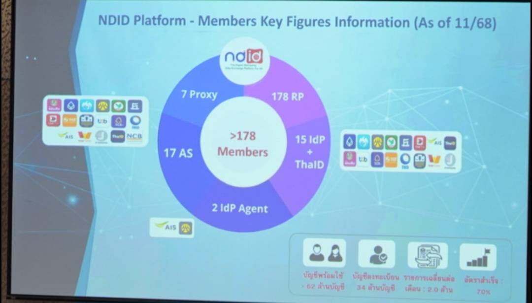 นายบุญสันต์ ประสิทธิ์สัมฤทธิ์ ผู้จัดการใหญ่ บริษัท เนชั่นแนลดิจิทัลไอดี จำกัด (NDID) เปิดเผยในงาน”การประชุมสัมมนาวิชาการระดับชาติกฎหมายและนโยบายเทคโนโลยีดิจิทัล” ว่า ปัจจุบันระบบ National Digital ID (NDID) ได้รองรับการทำธุรกรรมแล้วกว่า 2 ล้านรายการ และมีบัญชีที่ผ่านการยืนยันตัวตนมากกว่า 62 ล้านบัญชี จากประชากรที่มีบัญชีรวมกว่า 80 ล้านบัญชีในประเทศ ถือเป็นการยกระดับโครงสร้างพื้นฐานดิจิทัลที่ช่วยให้ประชาชนสามารถเปิดบัญชีธนาคารหรือทำธุรกรรมต่าง ๆ ได้โดยไม่ต้องใช้เอกสารกระดาษ ลดขั้นตอนที่ซับซ้อน และสร้างความเชื่อมั่นให้ทั้งประชาชน ธนาคาร และหน่วยงานกำกับดูแล