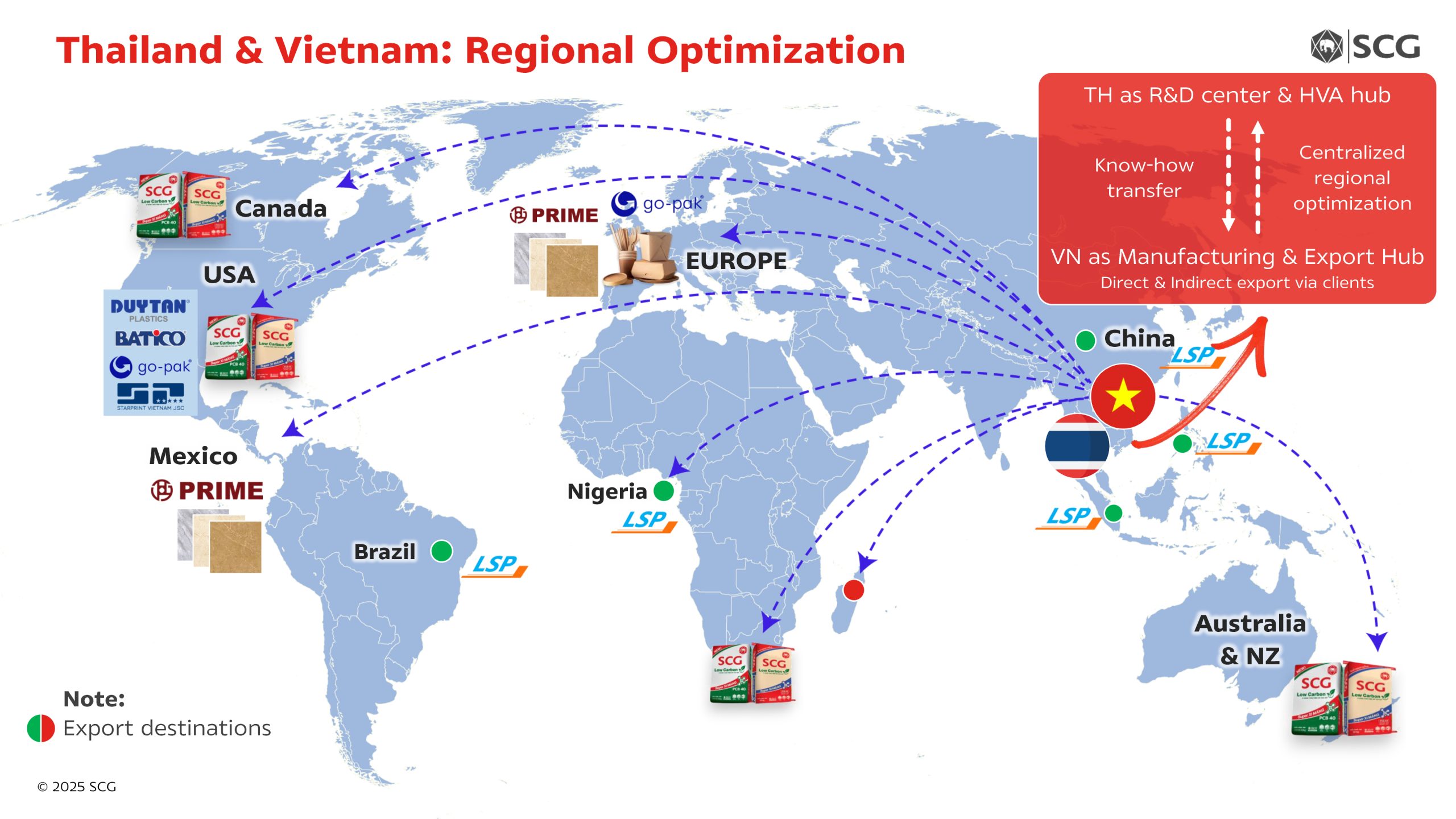 SCG รุกกลยุทธ์บริหารธุรกิจแบบบูรณาการทั่วอาเซียน (Regional Optimization) ผลักดันเวียดนามให้เป็นฐานการผลิตด้วย 3 เป้าหมายคือ 1.รองรับการบริโภคสูงภายในประเทศ 2.ผลิตสินค้าทดแทนการนำเข้า และ3.ส่งออกไปสู่ตลาดโลก โดยผสานจุดแข็งฐานการผลิตหลากหลายในอาเซียน ได้แก่ ไทย อินโดนีเซีย ฟิลิปปินส์ กัมพูชา ลาว และเมียนมา โดยไม่ได้มองเวียดนาม stand alone เพื่อเพิ่มประสิทธิภาพและสร้างความได้เปรียบได้ดียิ่งขึ้น