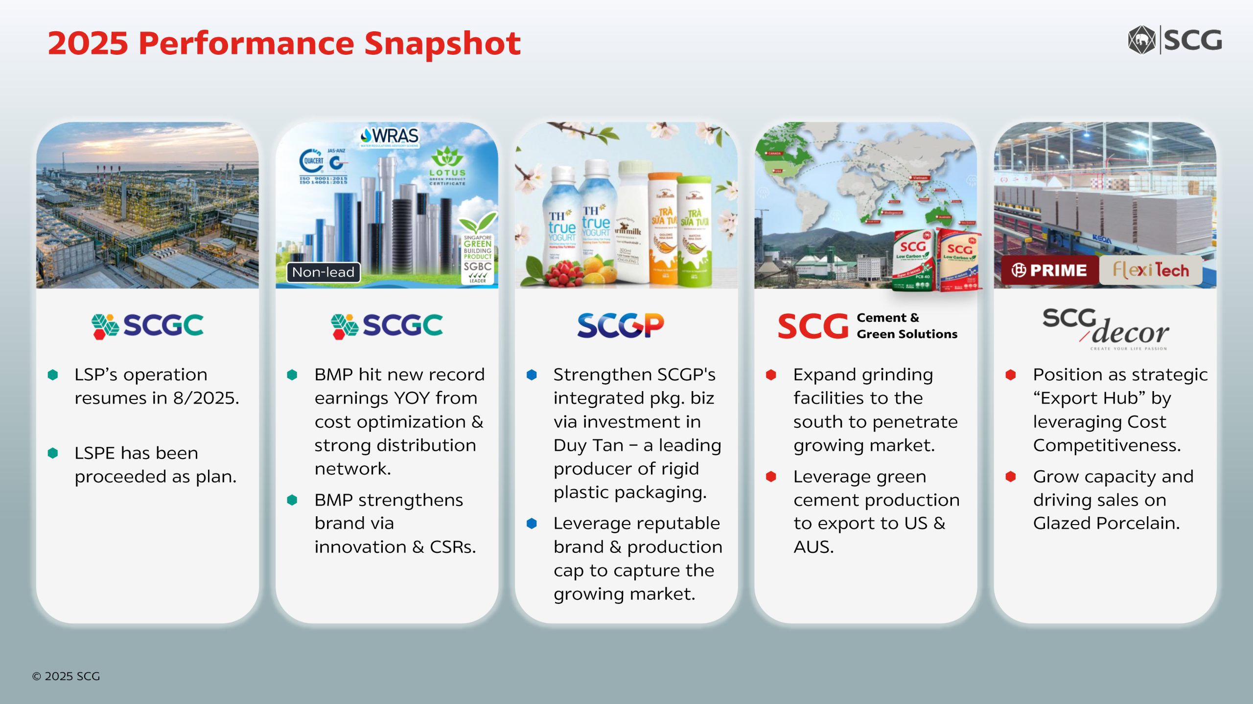 ทั้งนี้ในไตรมาสที่ 3/2568 GDP มีมูลค่ากว่า 3.27 แสนล้านดอลลาร์สหรัฐฯ ขยายตัวถึง 8% และตั้งเป้าหมายโตเฉลี่ย 10% ภายในปี 2573 SCG พร้อมที่จะเติบโตไปพร้อมกับพื้นฐานของประเทศเวียดนามที่แข็งแกร่ง มีประชากรกว่า 106 ล้านคน และกว่า 70% อยู่ในวัยทำงาน อายุเฉลี่ย 32 ปี มีกำลังในการบริโภค ถือเป็นเครื่องยนต์สำคัญถึง 60%ที่ผลักดันการเติบโตทางเศรษฐกิจ
