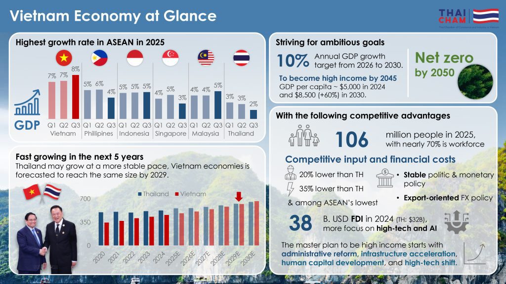 นอกจากนี้เวียดนามมีการตั้งเป้าหมายเพื่อก้าวสู่การเป็นประเทศรายได้สูงภายในปี 2588 โดยในปีที่ผ่านมารายได้ต่อหัวอยู่ที่ประมาณ 5,000 ดอลลาร์สหรัฐฯ และคาดว่าจะเพิ่มขึ้นเป็น 8,500 ดอลลาร์สหรัฐฯ ภายในปี 2573 เติบโตขึ้นกว่า 60% ในช่วงเวลาเพียง 6 ปี สะท้อนถึงการเติบโตของกำลังซื้อในประเทศที่มากขึ้น และเป็นโอกาสสำคัญของธุรกิจภาคบริการและการค้าปลีก