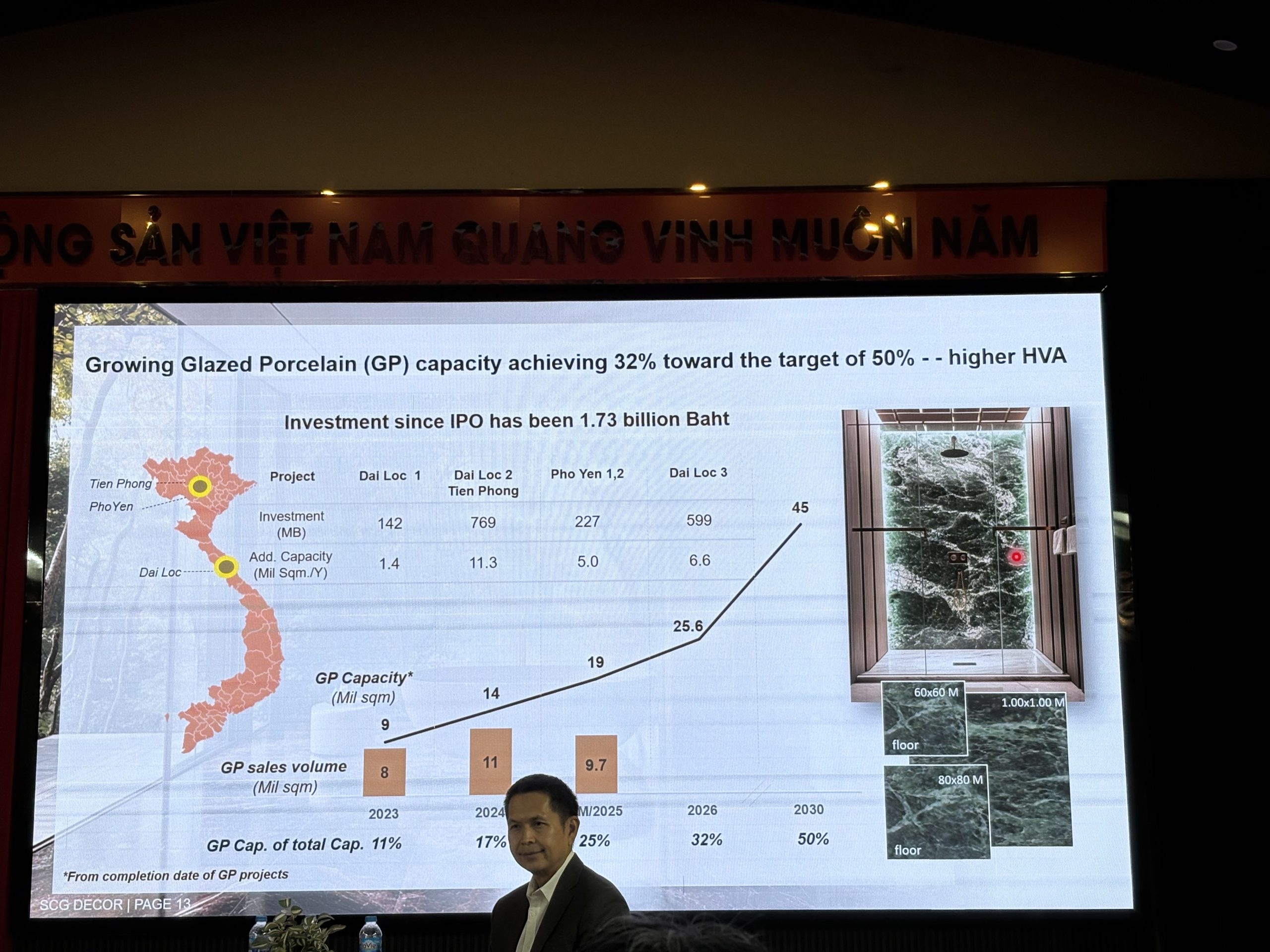 PRIME โฟกัสตลาดพรีเมี่ยมเพื่อมาร์จิ้นที่ดีกว่า มีออเดอร์สั่งทำหรือ make to Order ถึง 40% ใช้เทคโนโลยีใหม่ กำจัดแบคทีเรีย เพิ่มรายได้ และกำไร จากในช่วง 9 เดือนปีนี้ รายได้มีสัดส่วน 17% ตั้งเป้าแตะ 30% หรือเพิ่มขึ้น 3 เท่าตัวจากที่เคยมีสัดส่วน 10-11% และปรับไลน์การผลิต เพิ่มประสิทธิภาพการผลิต ตั้งแต่การลดของเสีย ประหยัดพลังงาน ไปจนถึงการลดการปล่อยก๊าซเรือนกระจก เพิ่มขนาดของกระเบื้องตามที่ลูกค้าต้องการ ขยายกำลังการผลิตกระเบื้องพอร์ซเลนที่ผ่านการเคลือบผิว หรือ Glazed Porcelain (GP) ต้นทุนรวมของกระเบื้อง GP ได้เทียบผู้ผลิตชั้นนำระดับโลก โดยในปี 2568 มีกำลังการผลิต GP 19 ล้านตารางเมตร หรือประมาณ 25% ของกำลังผลิตทั้งหมด และตั้งเป้าเพิ่มกำลังการผลิตขึ้นถึง 45 ล้านตารางเมตร ประมาณ 50% ของกำลังการผลิตทั้งหมด