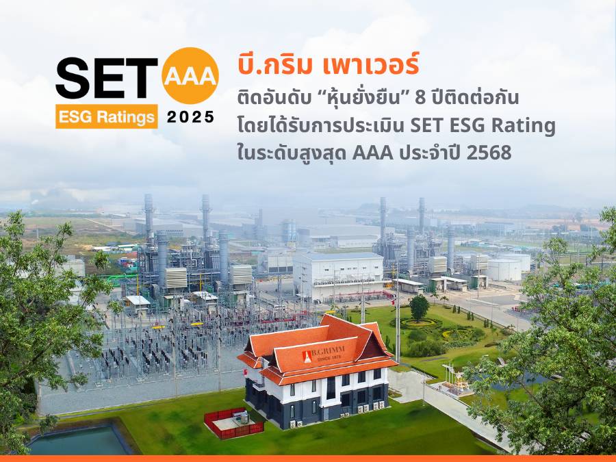 HoonSmart.com>>บี.กริม เพาเวอร์ (BGRIM) ได้รับการประเมินด้านความยั่งยืนในระดับสูงสุด “AAA” จาก SET ESG Ratings ประจำปี 2568 ด้วยคะแนนสูงสุดในกลุ่มอุตสาหกรรมทรัพยากร (Resources) และได้รับคัดเลือกให้อยู่ในรายชื่อหุ้นยั่งยืนของตลาดหลักทรัพย์แห่งประเทศไทยต่อเนื่องเป็นปีที่ 8 สะท้อนถึงการดำเนินธุรกิจที่ให้ความสำคัญกับผู้มีส่วนได้ส่วนเสีย การบริหารจัดการความเสี่ยง และการสร้างคุณค่าในระยะยาว
