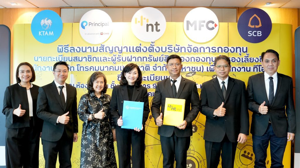 นายสุรเชษฐ์ ศรีพลกรัง (ที่ 3 จากขวา) รองกรรมการผู้จัดการใหญ่สายงานยุทธศาสตร์องค์กร บริษัท โทรคมนาคมแห่งชาติ จำกัด (มหาชน) และประธานคณะกรรมการกองทุนสำรองเลี้ยงชีพ พนักงาน บริษัท โทรคมนาคมแห่งชาติ จำกัด (มหาชน) เพื่อพนักงาน ทีโอที ซึ่งจดทะเบียนแล้ว (“NT for TOT”) และนางชวินดา หาญรัตนกูล (กลาง) กรรมการผู้จัดการ บริษัทหลักทรัพย์จัดการกองทุน กรุงไทย จำกัด (มหาชน) (“KTAM”) ได้ร่วมลงนามในพิธีสัญญาแต่งตั้ง บลจ.กรุงไทย เป็นผู้บริหารจัดการกองทุนสำรองเลี้ยงชีพ พนักงาน บริษัท โทรคมนาคมแห่งชาติ จำกัด (มหาชน) เพื่อพนักงาน ทีโอที ซึ่งจดทะเบียนแล้ว ณ บมจ.โทรคมนาคมแห่งชาติ เมื่อเร็ว ๆ นี้ โดยภายในงานได้รับเกียรติจากผู้บริหาร และคณะกรรมการจัดการกองทุนฯ เข้าร่วมเป็นสักขีพยานอย่างคับคั่ง