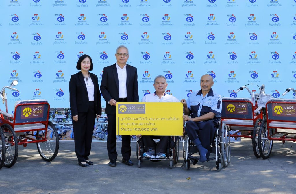 นายไพโรจน์ ชื่นครุฑ (ที่ 2 จากซ้าย) ประธานคณะเจ้าหน้าที่ด้านกลยุทธ์และวางแผนธุรกิจองค์กร ธนาคารกรุงศรีอยุธยา จำกัด (มหาชน) ในฐานะผู้แทนมูลนิธิกรุงศรี มอบเงินบริจาคจำนวน 100,000 บาท ให้แก่มูลนิธิคนพิการไทย โดยมี นายกิตติพงษ์ หาดทวายกาญจน์ (ที่ 2 จากขวา) กรรมการและเหรัญญิก มูลนิธิคนพิการไทย เป็นผู้รับมอบ เพื่อนำไปจัดทำรถสามล้อโยกสำหรับผู้สูงอายุและผู้พิการในโครงการ “เป็นแขน – ขา ให้ตากะยาย”