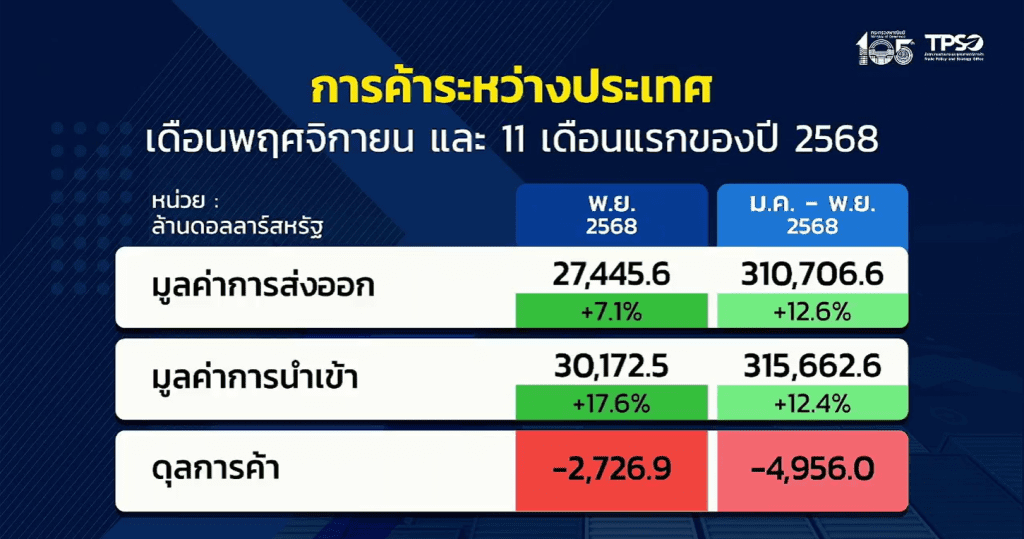 นายนันทพงษ์ จิระเลิศพงษ์ ผู้อำนวยการสำนักงานนโยบายและยุทธศาสตร์การค้า แถลงตัวเลขส่งออกไทยเดือนพ.ย.2568 มีมูลค่า 27,445 ล้านดอลลาร์สหรัฐฯ หรือ 890,204 ล้านบาท ขยายตัว 7.1% ซึ่งนับเป็นการขยายตัวต่อเนื่องเป็นเดือนที่ 17 ส่วนการนำเข้า มีมูลค่า 30,172 ล้านดอลลาร์สหรัฐฯ หรือ 991,244 ล้านบาท ขยายตัว 17.6% ส่งผลให้ไทยขาดดุลการค้า 2,726 ล้านดอลลาร์สหรัฐฯ