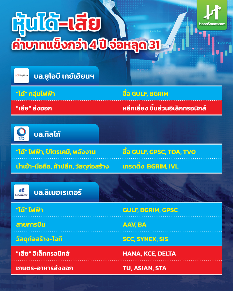 “กลยุทธ์การปรับพอร์ต หากถือหุ้นส่งออกอยู่ อย่าเพิ่งตกใจ ให้ตรวจสอบว่าบริษัทนั้นมี “Natural Hedge” หรือไม่ (คือมีรายได้ดอลลาร์ แต่ก็มีรายจ่ายเป็นดอลลาร์ด้วย) ซึ่งจะช่วยลดผลกระทบได้ระดับหนึ่ง ส่วนใครที่เล็งกลุ่มโรงไฟฟ้าไว้ ช่วงนี้อาจเป็นจังหวะที่ได้รับอานิสงส์จากกำไรอัตราแลกเปลี่ยนในงบการเงินไตรมาสสุดท้าย”บล.ลิเบอเรเตอร์แนะนำ
