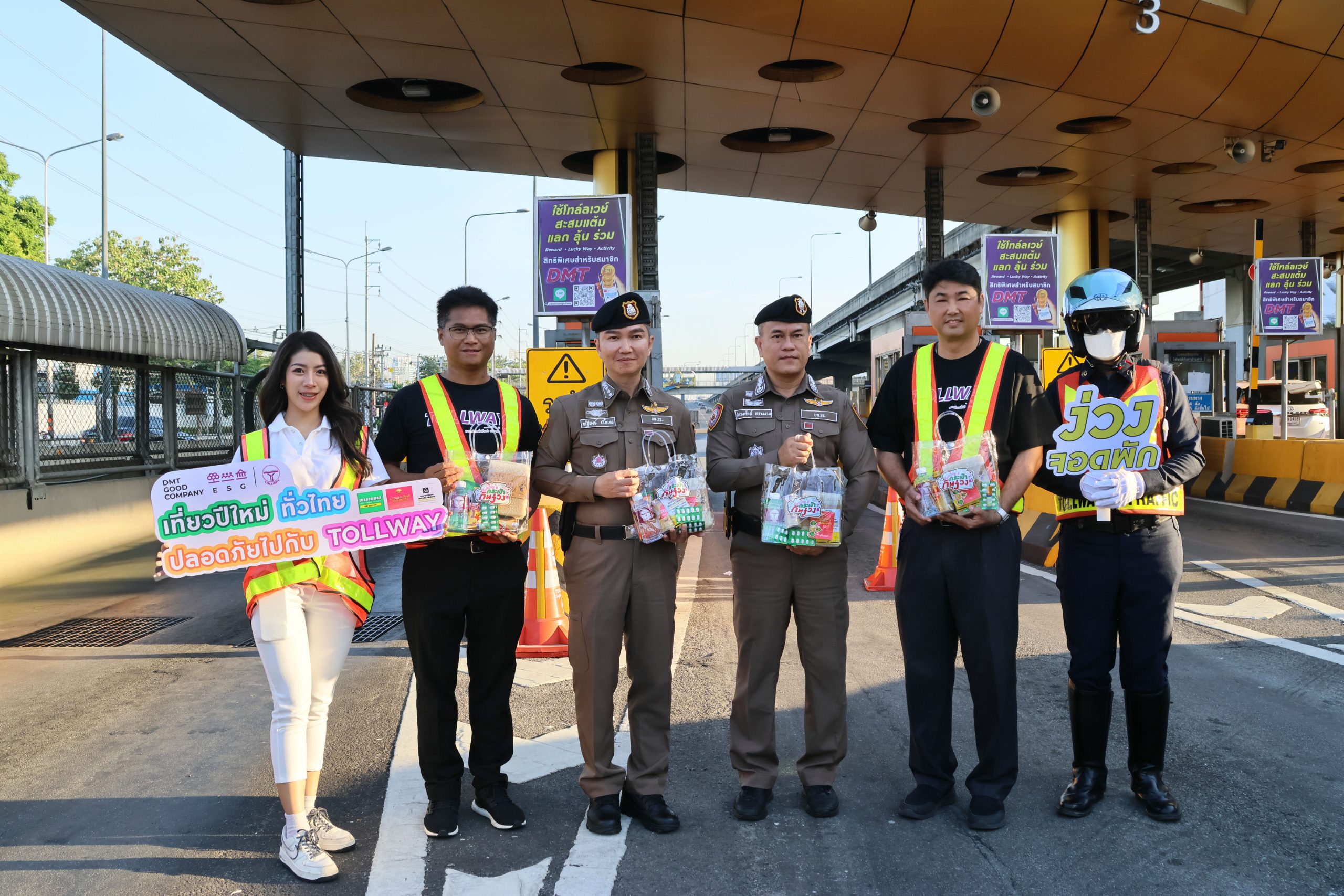 บริษัท ทางยกระดับดอนเมือง (DMT) นำโดย ดร.สัณห์ พันธ์อุไร (คนที่2จากขวา) ผู้ช่วยรองกรรมการผู้จัดการสายงานปฏิบัติการและนาย นพพล โพธิ์ขี (คนที่2จากซ้าย) ผอ.ฝ่ายพัฒนาธุรกิจและกลยุทธ์เพื่อความยั่งยืน พร้อมด้วย พล.ต.ต.ดำรงศักดิ์ สว่างงาม (คนที่3จากขวา) ผบก.จร. และพ.ต.อ.ณัฐพงษ์ เชื้อเดช (คนที่3จากซ้าย) รอง ผบก.จร. ให้เกียรติร่วมมอบกระเป๋ากันง่วง “เที่ยวปีใหม่ทั่วไทย ปลอดภัยไปกับโทล์ลเวย์” กับทีมDMT เพื่อแทนความห่วงใยและร่วมรณรงค์ขับขี่อย่างมีวินัย เพื่อความปลอดภัยในการใช้รถใช้ถนนอย่างยั่งยืน ณ ด่านดินแดง 1 ทางยกระดับอุตราภิมุข