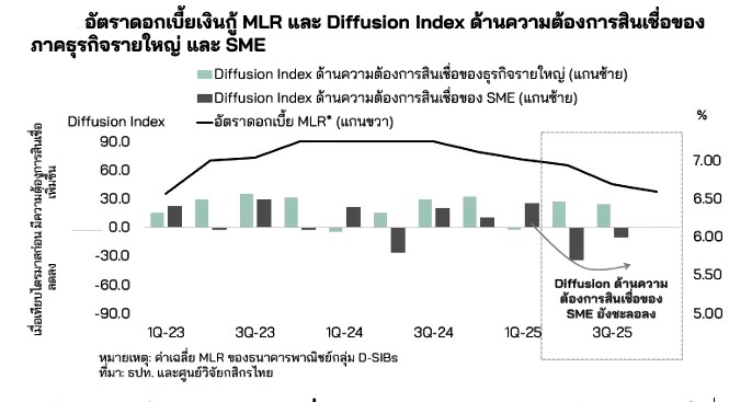 ปัจจุบันพฤติกรรมผู้กู้จำนวนมากยังอยู่ในภาวะระมัดระวัง ชะลอการตัดสินใจก่อหนี้เพิ่มเติม ซึ่งจะกลายเป็นภาระผูกพันระยะยาว โดยเฉพาะกลุ่ม SME ที่การฟื้นตัวของรายได้มีความไม่แน่นอนกว่ากลุ่มธุรกิจรายใหญ่ สะท้อนจากดัชนี Diffusion Index ด้านความต้องการสินเชื่อของ SME ที่มีทิศทางชะลอลงตั้งแต่ช่วงกลางปี 2568 แม้อัตราดอกเบี้ยเงินกู้จะยังคงทยอยลดลงรวมถึงสัญญาณเศรษฐกิจที่มีความเปราะบาง และข้อจำกัดเชิงโครงสร้างของภาคการผลิต มีผลกระทบต่อเนื่องต่อบรรยากาศการลงทุนและการเบิกใช้สินเชื่อของภาคธุรกิจ ซึ่งทำให้สถานการณ์ Debt Deleveraging ยังดำเนินต่อไปในปี 2569