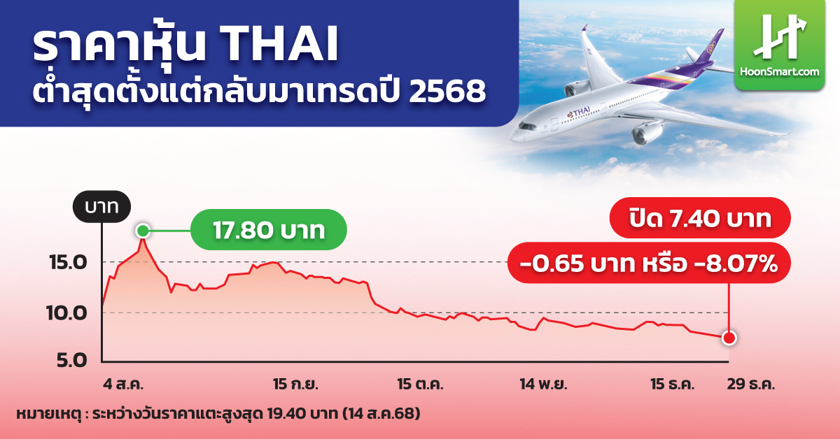 ด้านราคาหุ้น THAI  ดิ่ง 8.07% หรือ -0.65 บาท ปิดต่ำสุด 7.40 บาท  ด้วยมูลค่าการซื้อขาย 412.57  ล้านบาท หุ้นปิดนิวโลว์ นับตั้งแต่หุ้นกลับเข้ามาซื้อขายในตลาดหลักทรัพย์แห่งประเทศไทย (SET) วันที่ 4 ส.ค.2568  ทั้งนี้ราคาพุ่งขึ้นสูงสุด 19.40  บาท