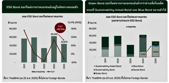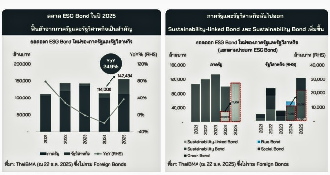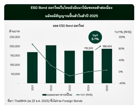 “ตลาด ESG Bond ฟื้นตัว มาจากภาครัฐและรัฐวิสาหกิจปรับทิศทางการออกพันธบัตร มาออก Sustainability-linked Bond และ Sustainability Bond เพิ่มขึ้น กลายเป็นแรงส่งสำคัญที่ทำให้ตลาด ESG Bond ในปี 2568 ฟื้นตัว ด้วยยอดออกใหม่รวมกันกว่า 142,434 ล้านบาท (ณ 22 ธ.ค.) เพิ่มขึ้นจากปีก่อน 24.9% ซึ่งอยู่ที่ 114,000 ล้านบาท”