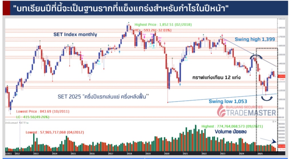 สำหรับปี 2568 เหลืออีกเพียง 2 วันก่อนเข้าสู่ปีใหม่นับเป็นอีกหนึ่งปีที่ยากลำบากสำหรับตลาดหุ้นไทย ประเมินว่าดัชนี SET ปิดผลตอบแทนติดลบต่อเนื่องเป็นปีที่ 3 จุดสูงสุดของปีเกิดขึ้นตั้งแต่วันแรกเปิดตลาดที่ 1,399 จุด ก่อนใช้เวลาครึ่งปีแรกปรับตัวลงต่อเนื่องจนทำจุดต่ำสุดที่ 1,053 จุดในเดือนมิถุนายน จากนั้นจึงเริ่มฟื้นตัวในครึ่งปีหลัง