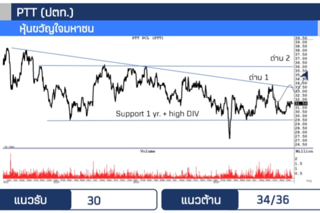 แนะนำ ถือ PTT ข้ามปี เป็นหุ้นขวัญใจมหาชน PTT ค่อย ๆ ฟื้นตัวขึ้นจากโซนรับ (strong support) บริเวณ 30 บาท + Dividend Yield กว่า 6% หากไม่หลุดแนวรับ แนะนำสะสมต่อ โดยมีเป้าหมายด่านแรกที่ 34 บาท และถัดไปที่ 36 บาท