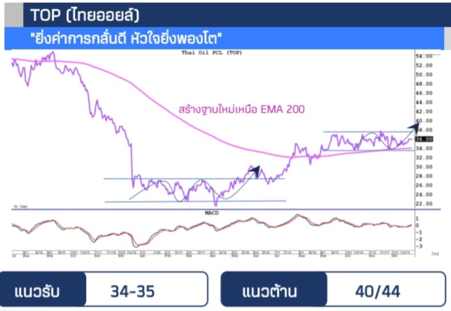 TOP สร้างฐานใหม่เหนือเส้น EMA 200 วัน ได้สำเร็จ ปัจจุบันรอจังหวะกลับตัว หากทะลุแนวต้าน 37 บาทขึ้นไปได้ มีโอกาสปรับขึ้นสู่เป้าหมายที่ 40 และ 44 บาทตามลำดับ แนะนำ “ถือต่อ”