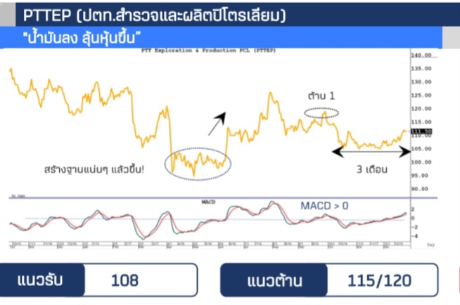 PTTEP เริ่มฟื้นตัวภายหลังจากการสร้างฐานแน่น 3 เดือน บริเวณ 105 บาท นอกจากนี้ MACD สามารถทะลุผ่านเส้นศูนย์ได้สำเร็จ