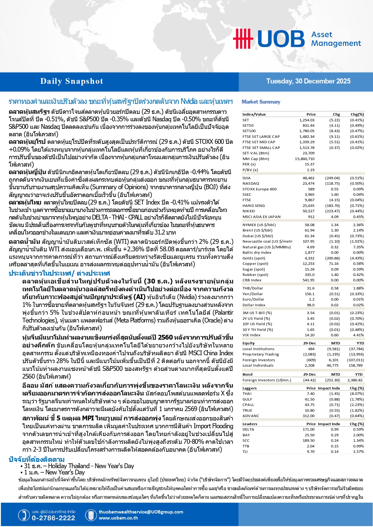UOBAM Daily Snapshot : ราคาทองคำ-เงินปรับตัวลง “หุ้นสหรัฐฯ” ปิดร่วงกดดันจาก Nvidia-หุ้นเทคฯ