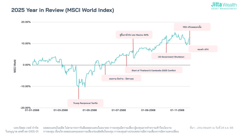 สำหรับภาพรวมการลงทุนโลกในปี 2568 ถือเป็นอีกปีที่นักลงทุนทั่วโลกต้องเผชิญกับความไม่แน่นอนจากหลากหลายมิติ ที่มากระทบกับอารมณ์ของนักลงทุนที่ต้องเผชิญกับความผันผวนรุนแรง แต่สิ่งที่ได้เรียนรู้ คือ นักลงทุนที่ยังลงทุนอย่างมีหลักการและรักษาวินัยในการลงทุนไว้ได้ ยังช่วยให้พอร์ตลงทุนได้รับผลกระทบน้อยและเติบโตได้ต่อเนื่อง ได้แก่