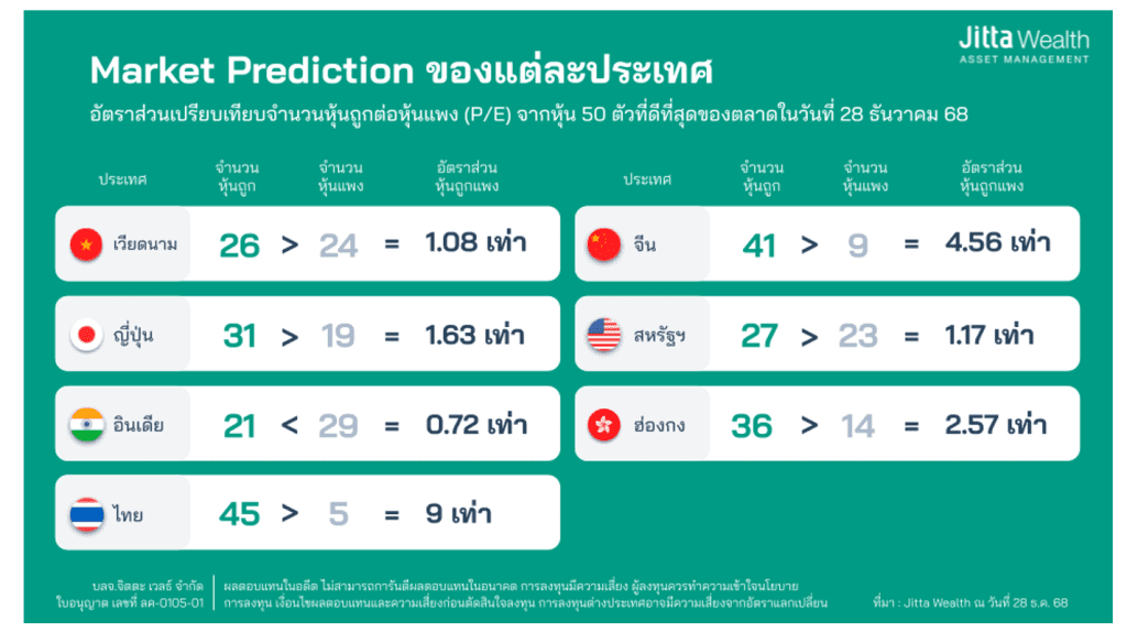 สำหรับการลงทุนปี 2569 ตลาดที่น่าสนใจ จากข้อมูล AI Market Prediction ของ Jitta Wealth ที่สามารถบ่งบอกตลาดถูกแพง ของแต่ละประเทศในแต่ละปีจะพบว่า AI ยังชี้เป้าไปที่ประเทศจีนที่มีจำนวนหุ้นดีราคาถูกมากกว่าหุ้นดีแต่ราคาแพงถึง 4.56 เท่า ตามมาด้วย ฮ่องกง ที่ 2.57 เท่า ญี่ปุ่น 1.63 เท่า ขณะที่หุ้นไทยเอง อาจจะมีจำนวนหุ้นดีราคาถูกอยู่ถึง 9 เท่า แต่ก็มีความกดดันเชิงโครงสร้างทางเศรษฐกิจอยู่