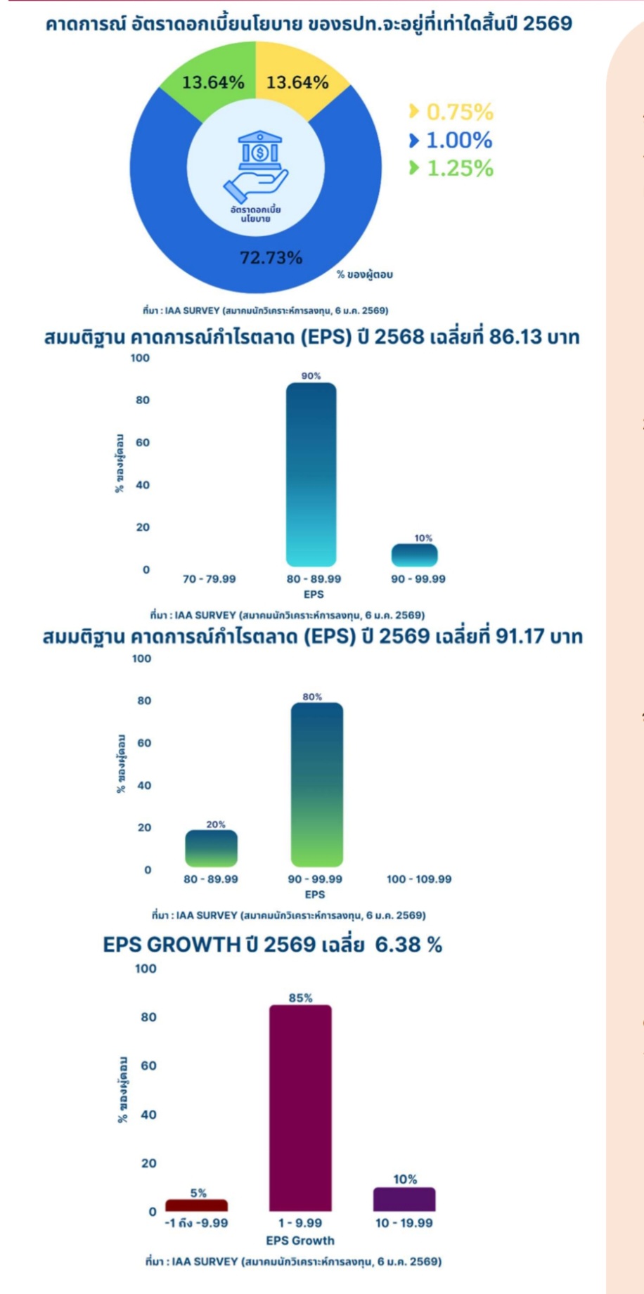 HoonSmart.com>>สมาคมนักวิเคราะห์การลงทุน คาด SET ปี’69 ฟื้นต่อเนื่อง ไตรมาสแรกแตะ 1,322 จุด สิ้นปี 1,389 จุด ด้าน EPS เพิ่มขึ้น 5.04 บาท ยืนที่ 91.17 บาทต่อหุ้น ผลจากต้นทุนดอกเบี้ยลด ย้ำปันผลไว้ใจหุ้นไทย ลุ้น Event Play เลือกตั้ง ดึงเงินต่างชาติ 6 หมื่นล้านบาท
