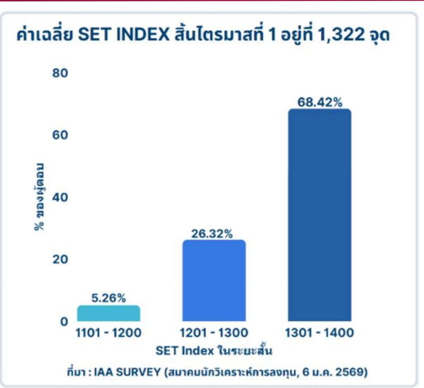 นายสมบัติ นราวุฒิชัย เลขาธิการ สมาคมนักวิเคราะห์การลงทุน (IAA) คาดว่าดัชนีหุ้นไทยสิ้นไตรมาส 1 ปี 2569 จะเฉลี่ยอยู่ที่ 1,322 จุด และสิ้นปีจะเฉลี่ยอยู่ที่ 1,389 จุด โดยมีกรอบสูงสุดที่ 1,427 จุด และต่ำสุดเฉลี่ยที่ 1,187 จุด