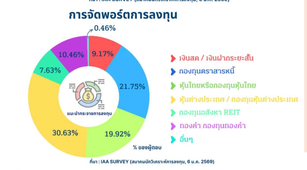 สำหรับการจัดพอร์ตการลงทุนปี 2569 สมาคมฯ แนะนำถือเงินสดและเงินฝากระยะสั้น 9.17% กองทุนตราสารหนี้ 21.75% หุ้นต่างประเทศหรือกองทุนหุ้นต่างประเทศ 30.63% หุ้นไทยหรือกองทุนหุ้นไทย 19.92% ทองคำ 10.46% กองทุนอสังหา/REIT 7.63% และสินทรัพย์ดิจิทัล 0.46%