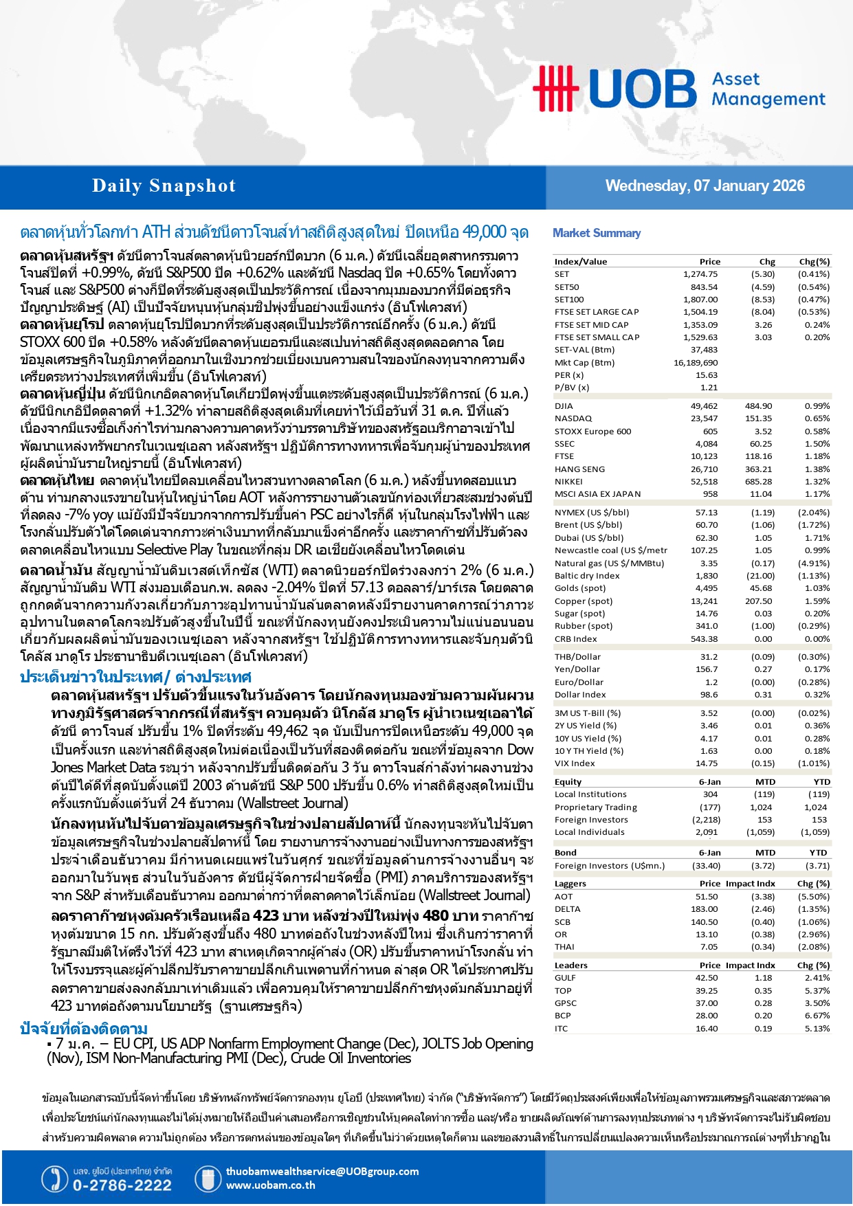 UOBAM Daily Snapshot : ตลาดหุ้นทั่วโลกทำ ATH – ดาวโจนส์ทำสถิติสูงสุดใหม่ ปิดเหนือ 49,000 จุด 07/01/2026 10:33009Breaking News, Fund Manager Facebook iconFacebookTwitter iconTwitterLINE iconLine
