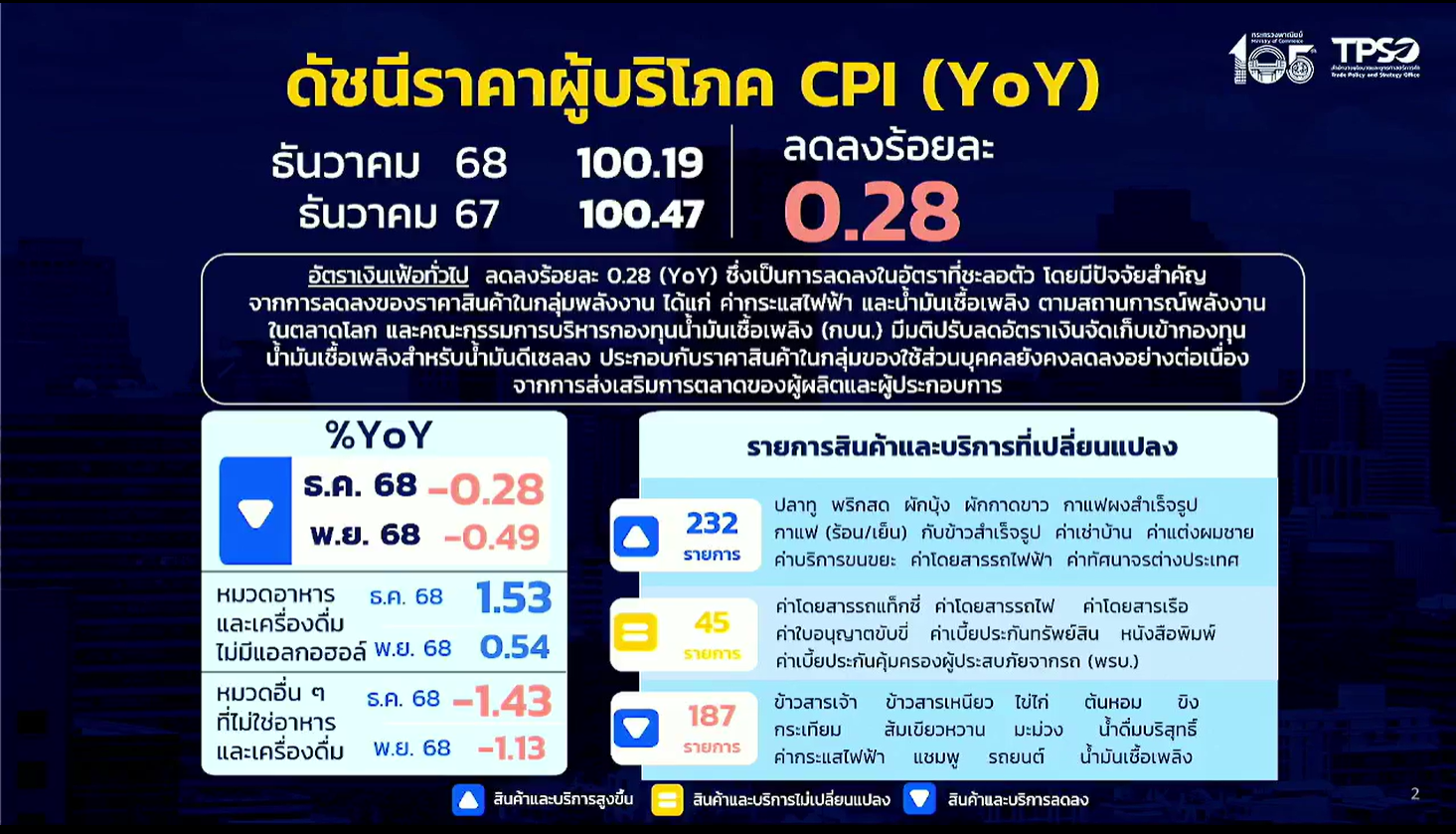 นายนันทพงษ์ จิระเลิศพงษ์ ผู้อำนวยการสำนักงานนโยบายและยุทธศาสตร์การค้า กระทรวงพาณิชย์ เปิดเผยว่า ดัชนีราคาผู้บริโภคทั่วไปของไทย เดือนธ.ค.2568 ลดลง 0.28%YoY (จากที่ตลาดคาด -0.22 ถึง -0.35%) โดยเป็นการติดลบต่อเนื่องเป็นเดือนที่ 9 ส่งผลให้เงินเฟ้อปี 2568 ลดลง 0.14% โดยเป็นการติดลบในรอบ 5 ปี