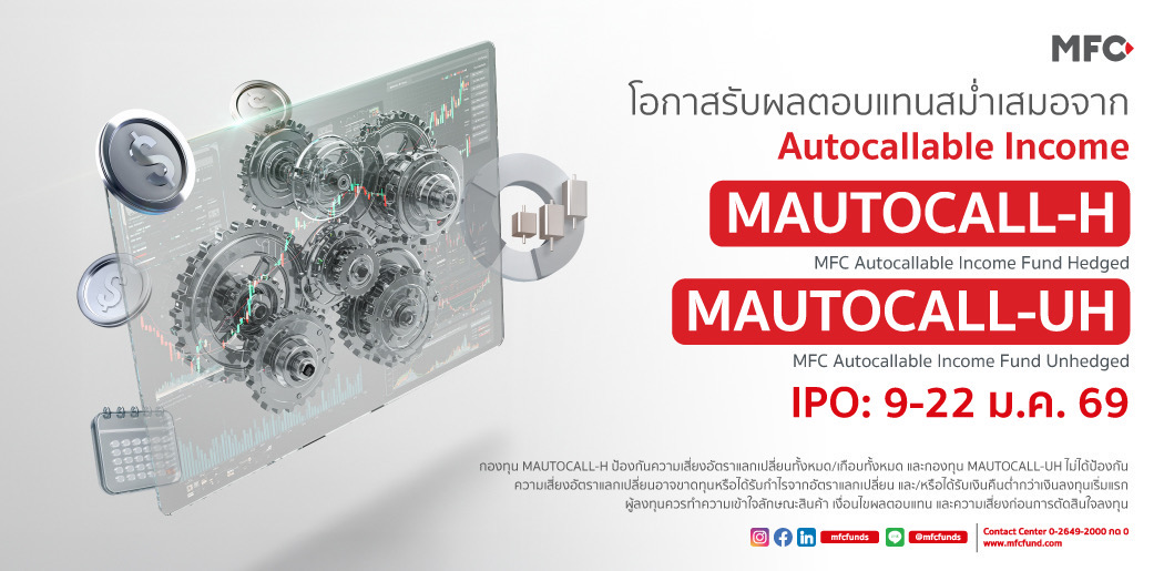 HoonSmart.com>> บลจ.เอ็มเอฟซี เปิดตัวกองทุน “MAUTOCALL” ชูโอกาสรับผลตอบแทนสม่ำเสมอจาก Autocallable Income ผ่านกองทุนหลัก Calamos Autocallable Income ETF (CAIE) ซื้อขายได้ทุกวันทำการ ด้วย 2 ทางเลือกลงทุนแบบป้องกันความเสี่ยงค่าเงิน (MAUTOCALL-H) และแบบไม่ป้องกันความเสี่ยงค่าเงิน (MAUTOCALL-UH) เปิดขาย IPO วันที่ 9-22 ม.ค.69 นี้