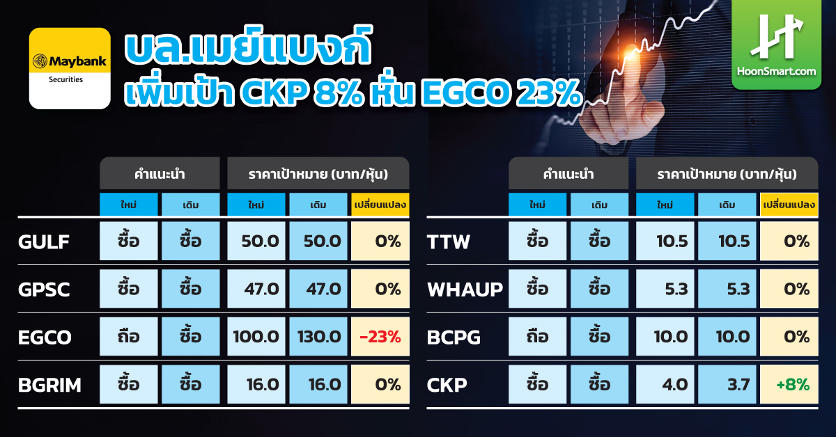 นอกจากนี้ยังคงแนะนำซื้อหุ้น CKP ปรับเพิ่มราคาเป้าหมายขึ้น 8% จากเดิมให้ไว้ 3.70 บาท เป็น 4 บาท และปรับลดเป้าหมาย EGCO ลง 23% เหลือ 100 บาท จาก 130 บาท