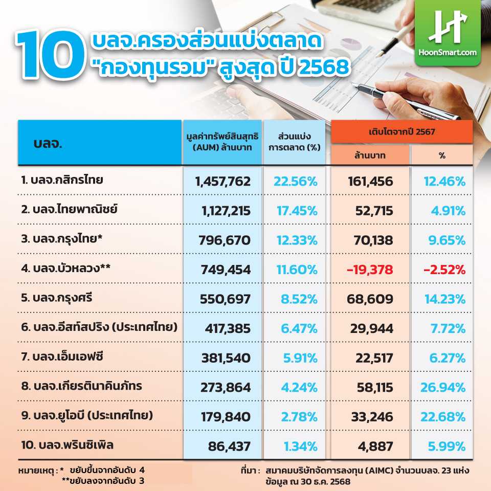 ภาพรวมอุตสาหกรรมกองทุนรวม ในปี 2568 มีมูลค่าทรัพย์สินสุทธิ (AUM) ทั้งสิ้น 6,460,453 ล้านบาท เติบโต 551,725 ล้านบาท หรือ 9.34% จากสิ้นปี 2567 มีมูลค่ารวมอยู่ที่ 5,908,726 ล้านบาท จากจำนวนบริษัทหลักทรัพย์จัดการกองทุนรวม (บลจ.)ทั้งหมด 23 แห่ง ณ วันที่ 31 ธ.ค.2568 (ข้อมูลสมาคมบริษัทจัดการลงทุน : AIMC) โดยมูลค่าทรัพย์สินสุทธิที่เพิ่มขึ้นมาจากมูลค่าหุ้นที่ปรับตัวเพิ่มขึ้น รวมทั้งเม็ดเงินลงทุนใหม่เข้าสู่ระบบ