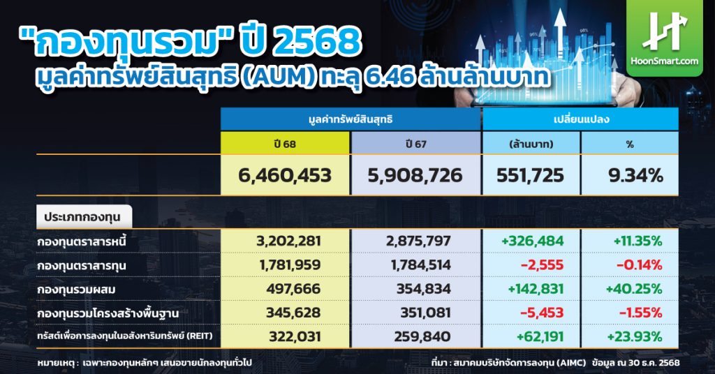 HoonSmart.com>>”กองทุนรวม” ปี 68 มูลค่าทรัพย์สินสุทธิ (AUM) ทะยานแตะ 6.46 ล้านล้านบาท เติบโต 5.51 แสนล้านบาท หรือ 9.34% “กองทุนตราสารหนี้” ยังเป็นเซฟโซนหลบความไม่แน่นอน ท่ามกลางความผันผวน “กองทุนผสม” โดดเด่น AUM เพิ่มขึ้น 40% กองทุนต่างประเทศโตต่อเนื่อง ด้านกองทุนลดภาษี “ThaiESG พุ่ง 217% แตะ 9.39 หมื่นล้านบาท ส่วน “LTF” มูลค่าลดเหลือ 3.86 หมื่นล้านบาท “บลจ.กสิกรไทย” ยังครองแชมป์บริหารเงินสูงสุด 1.46 ล้านล้านบาท