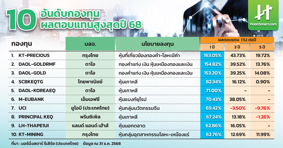 HoonSmart.com>>ส่องผลงาน “กองทุน” ปี 68 ท่ามกลางความผันผวนตลอดปีหนุน “โลหะมีค่าเงิน-ทองคำ” สร้างผลตอบแทนสุดปัง “กองทุน KT-PRECIOUS” บลจ.กรุงไทย ขึ้นแท่นผลงานสูงสุด 163% รองลงมา “กองทุน DAOL-GOLDRMF” บลจ.ดาโอ ผลตอบแทน 154.82% ฟาก “ตลาดหุ้นเกาหลี-หุ้นแบงก์ยุโรป-หุ้นกลุ่มนวัตกรรมจีน” ผงาดติดท็อปเทนผลตอบเด่น