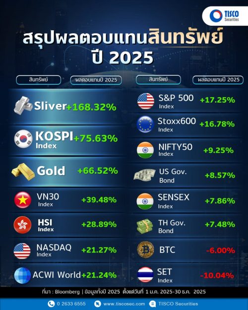 ดัชนี NASDAQ ตลาดหุ้นสหรัฐฯ อยู่ที่ 21.17% ,ดัชนี ACWI World อยู่ที่ 21.24% ,ดัชนี S&P 500 ตลาดหุ้นสหรัฐฯ อยู่ที่ 17.25% ,ตลาดหุ้นยุโรป (ดัชนี Stoxx600) อยู่ที่ 16.78% ,ตลาดหุ้นอินเดีย (ดัชนี NIFTY50) พันธบัตรรัฐบาลสหรัฐฯ อยู่ที่ 8.57%, ตลาดหุ้นอินเดีย (ดัชนี SENSEX) อยู่ที่ 7.86% , พันธบัตรรัฐบาลไทย 7.48%, บิทคอยน์ ติดลบ 6.00% และตลาดหุ้นไทย (ดัชนี SET) ติดลบ 10.04% (ข้อมูล บล.ทิสโก้ ตั้งแต่ 1 ม.ค.-30 ธ.ค.2568)