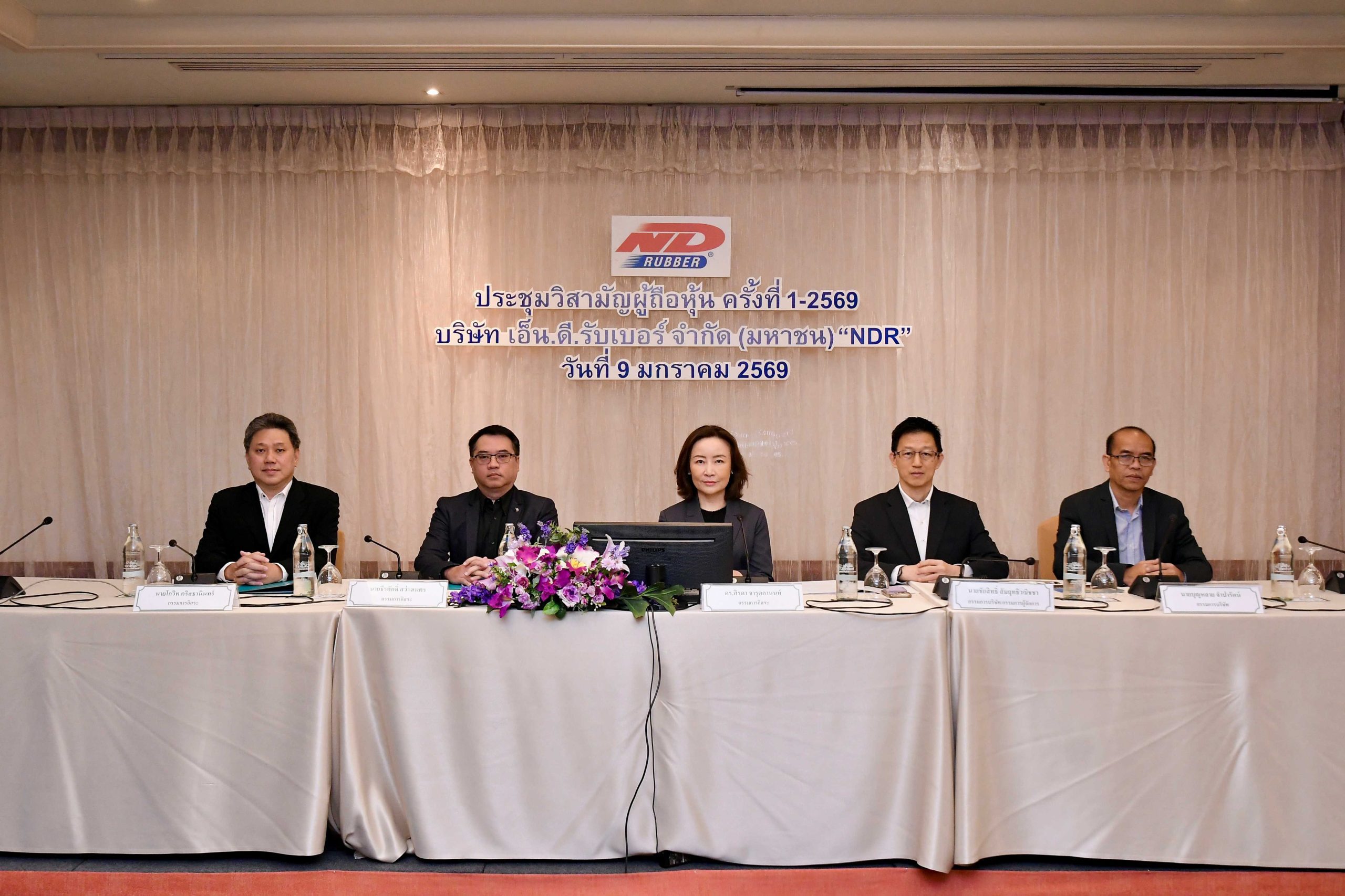 นายชัยสิทธิ์ สัมฤทธิวณิชชา (ที่ 2 จากขวา ) กรรมการผู้จัดการ และคณะกรรมการบริษัท เอ็น.ดี. รับเบอร์ (NDR) ผู้ผลิตและจำหน่ายยางนอกและยางในรถจักรยานยนต์ภายใต้แบรนด์ N.D.Rubber ถ่ายภาพร่วมกันภายหลังที่ประชุมวิสามัญผู้ถือหุ้น ครั้งที่ 1-2569 โดยที่ประชุมมีมติอนุมัติ EG Industries Berhad (EG) ทำคำเสนอซื้อหุ้นบางส่วน (Voluntary Partial Tender Offer) ของ NDR จากผู้ถือหุ้นเดิม