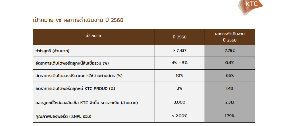 บริษัท บัตรกรุงไทย (KTC) เปิดเผยผลการดำเนินงานประจำปี 2568 มีกำไรสุทธิ 7,781.63 ล้านบาท กำไรต่อหุ้น 3.02 บาท เพิ่มขึ้น 4.6% จากงวดปี 2567 กำไรสุทธิ 7,437.16 ล้านบาท กำไรต่อหุ้น 2.88 บาท