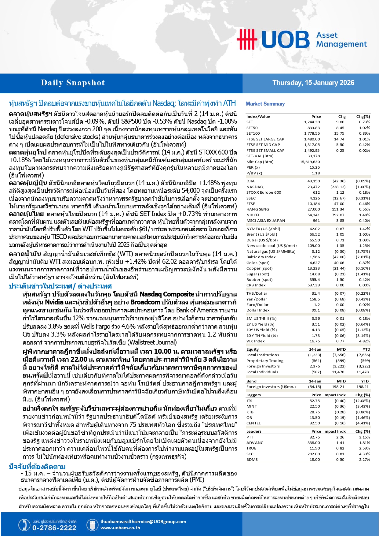 UOBAM : หุ้นสหรัฐฯ ปิดลบต่อจากแรงขายหุ้นเทคโนโลยีกดดัน Nasdaq – โลหะมีค่าพุ่งทำ ATH