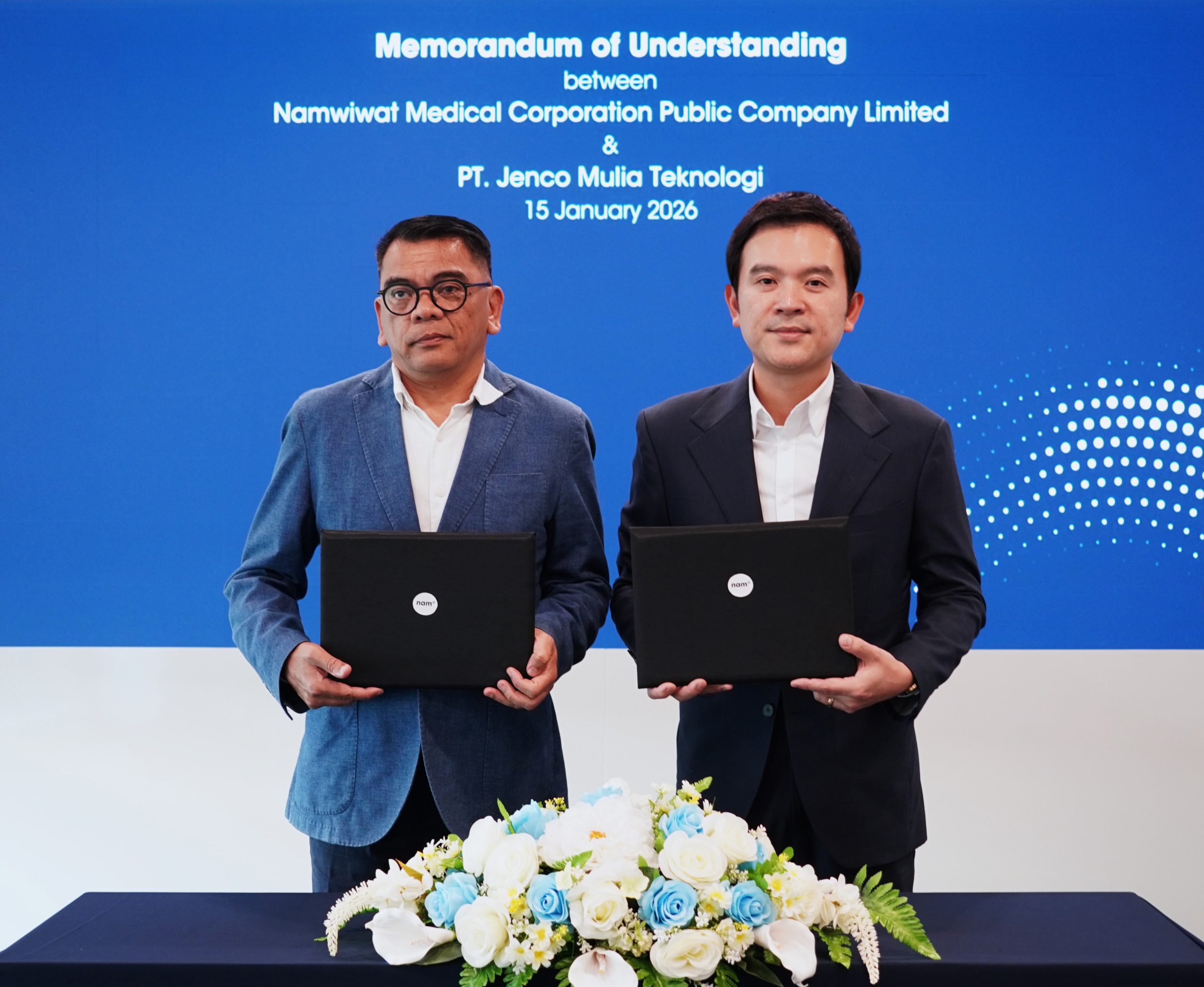 วิโรจน์ ชัยเทอดเกียรติ (ขวา) ประธานเจ้าหน้าที่บริหาร บริษัท นำวิวัฒน์ เมดิคอล คอร์ปอเรชั่น (NAM) ลงนามความร่วมมือเชิงกลยุทธ์กับ Mr.Joab Jenderiko Tarigan (ซ้าย) ประธานเจ้าหน้าที่บริหาร บริษัท PT. Jenco Mulia Teknologi ผู้ผลิตและจัดจำหน่ายเครื่องมือแพทย์ชั้นนำของประเทศอินโดนีเซีย