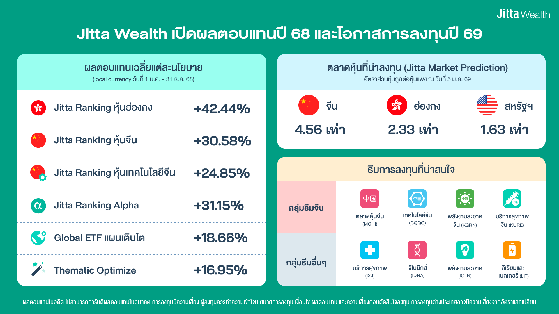 HoonSmart.com>> บลจ.จิตตะ เวลธ์ โชว์ฟอร์มแกร่ง พิสูจน์ผลงาน AI ด้วยผลตอบแทนปี 68 Jitta Ranking พุ่ง 42.44% ชี้ชัดการจัดพอร์ตแบบ Core & Satellite 80:20 ช่วยลูกค้าฝ่าความผันผวนด้วยผลตอบแทนสูงถึง 21.16% เผยโอกาสการลงทุนปี 69 AI “หุ้นจีน-ฮ่องกง-สหรัฐฯ” ยังมาแรง ธีมเด่น “จีน-บริการสุขภาพ-จีโนมิกส์-พลังงานสะอาด-ลิเทียมและแบตเตอรี” ชูกลยุทธ์ DCA Annual Boost 10% เร่งพอร์ตโตไว