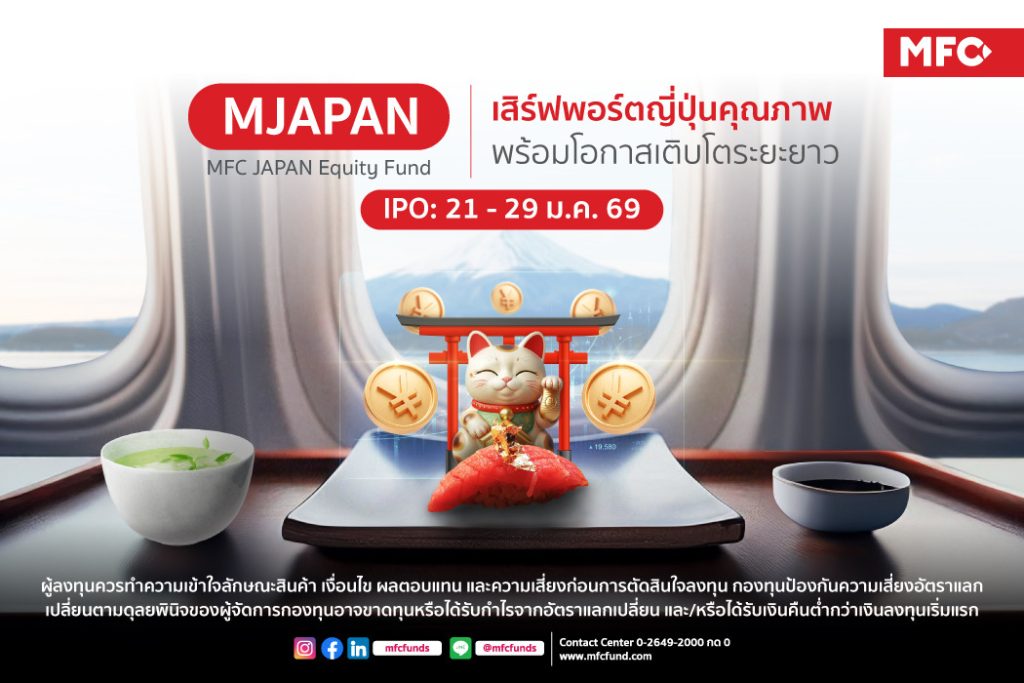 กองทุน MJAPAN เปิดขายครั้งแรก (IPO) ระหว่างวันที่ 21-29 มกราคม 2569 เงินลงทุนขั้นต่ำเพียง 1,000 บาท ทั้งนี้ ผู้ลงทุนควรทำความเข้าใจลักษณะสินค้า เงื่อนไข ผลตอบแทน และความเสี่ยงก่อนการตัดสินใจลงทุน กองทุนป้องกันความเสี่ยงอัตราแลกเปลี่ยนตามดุลยพินิจของผู้จัดการกองทุนอาจขาดทุนหรือได้รับกำไรจากอัตราแลกเปลี่ยน และ/หรือได้รับเงินคืนต่ำกว่าเงินลงทุนเริ่มแรก ผู้ที่สนใจสอบถามข้อมูลและขอรับหนังสือ ชี้ชวน ได้ที่บลจ.เอ็มเอฟซี จำกัด (มหาชน) และตัวแทนสนับสนุนการขาย หรือ โทรศัพท์ 0-2649-2000 ติดต่อฝ่ายวางแผนการลงทุน กด 2 หรือ Contact Center กด 0 สาขาแจ้งวัฒนะ โทร. 0-2835-3055-57 สาขาปิ่นเกล้า โทร.0-2014-3150-2 สาขาขอนแก่น โทร. 043-204-014-16 สาขาเชียงใหม่ โทร.0-5321-8480-82 สาขาระยอง โทร.033-100-340 สาขาหาดใหญ่ โทร. 074-232-324-25 หรือที่ www.mfcfund.com