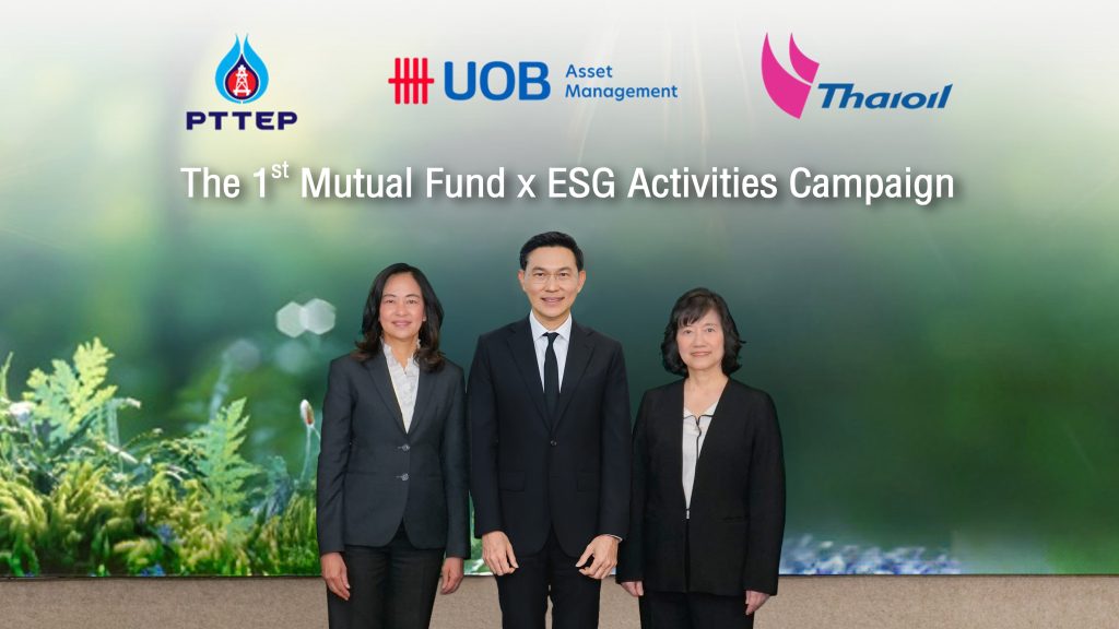เมื่อเร็วๆ นี้ นายวนา พูลผล ประธานเจ้าหน้าที่บริหาร บริษัทหลักทรัพย์จัดการกองทุน (บลจ.) ยูโอบี (ประเทศไทย) จำกัด นางชนมาศ ศาสนนันทน์ รองกรรมการผู้จัดการใหญ่ กลุ่มงานการเงินและการบัญชี บริษัท ปตท.สำรวจและผลิตปิโตรเลียม จำกัด (มหาชน) หรือ ปตท.สผ. และ นางวนิดา บุญภิรักษ์ รองกรรมการผู้จัดการใหญ่ ด้านการเงินและบัญชี บริษัท ไทยออยล์ จำกัด (มหาชน) ร่วมกันเปิดตัวโครงการ “The 1st Mutual Fund x ESG Activities Campaign” ที่เชื่อมโยงการบริหารการลงทุนเข้ากับกิจกรรมด้านสิ่งแวดล้อม สังคม และธรรมาภิบาล (ESG) อย่างเป็นรูปธรรม