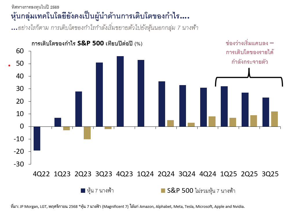 ขณะเดียวกัน แนะทำกำไรในหุ้นเทคโนโลยี และหุ้นเอไอ กระจายการลงทุนไปยังสินทรัพย์อื่นๆ เพิ่มขึ้น เช่นทองคำ หรือใช้กลยุทธ์หุ้นแบบ Long Short และอื่น ๆ เพื่อช่วยสร้างสมดุลและรองรับความผันผวนที่อาจเกิดขึ้นในอนาคต เพราะราคาหุ้นเทคโนโลยี และเอไอ ปรับสูงขึ้นมามากแล้ว มีความเสี่ยงต่อการเผชิญแรงขายทำกำไรเป็นระยะ เห็นได้จากหุ้น 7 นางฟ้าที่เดิมเป็นตัวขับเคลื่อนการเติบโตของกำไรในตลาดหุ้น S&P500 ช่วงปี 2566-2567 เริ่มแผ่วลง ในขณะที่หุ้นเทคโนโลยีนอกกลุ่ม 7 นางฟ้ามีการเติบโตของกำไรเพิ่มขึ้นอย่างต่อเนื่องตั้งแต่ไตรมาส 2 ของปี 2568 และคาดว่าแนวโน้มนี้จะยังคงเกิดขึ้นต่อเนื่องในปี 2569