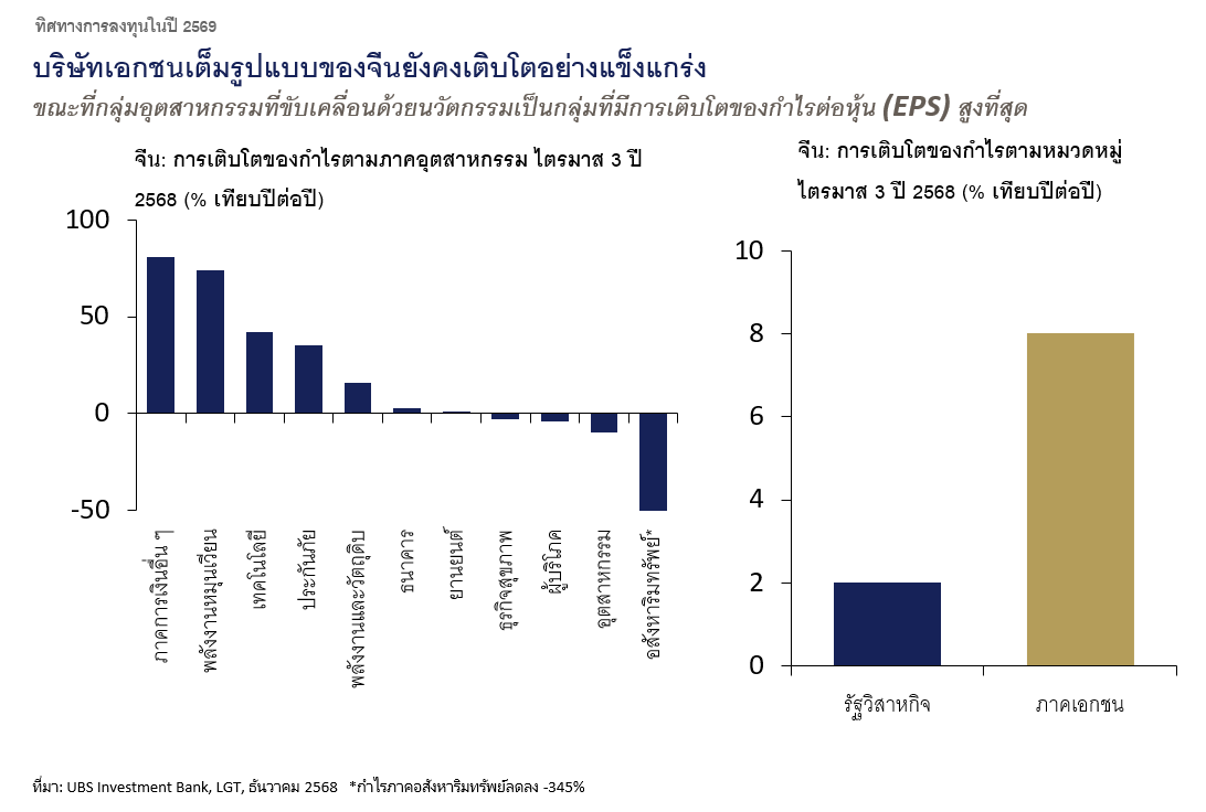 นอกจากนี้ แนะนำให้เพิ่มน้ำหนักการลงทุนในตลาดหุ้นจีน และญี่ปุ่น เพราะเศรษฐกิจยังคงเติบโตสูงกว่าเศรษฐกิจยุโรป สำหรับประเทศจีนบางอุตสาหกรรมมีแนวโน้มสร้างผลการดำเนินงานได้โดดเด่นกว่าอุตสาหกรรมอื่น ๆ ดังนั้น แทนที่จะลงทุนผ่านกองทุนดัชนีหรือกองทุน ETF การใช้กลยุทธ์การลงทุนเชิงรุกแบบคัดเลือกเฉพาะตัวจึงมีความเหมาะสมกว่า โดยมุ่งเน้นไปที่กลุ่มอุตสาหกรรมใน “เศรษฐกิจใหม่” อันดับ 1 แนะนำบริษัทขนาดใหญ่ที่เป็นบริษัทเอกชนในกลุ่มเทคโนโลยี เอไอ อินเตอร์เน็ตที่เป็นผู้ขับเคลื่อนนวัตกรรม ซึ่งได้รับผลกระทบด้านการส่งออกจากนโยบายภาษีของสหรัฐฯ น้อยมาก เมื่อเทียบกับอุตสาหกรรมอื่น ความต้องการบริโภคเทคโนโลยี และเอไอ ภายในประเทศยังคงเติบโตอย่างมาก และยังมีการเติบโตอย่างรวดเร็ว ตามด้วยกลุ่มการเงิน กลุ่มพลังงานสะอาด กลุ่มประกัน ที่ยังมีอัตราการเติบโตของกำไร (EPS) สูง แนะนำให้หลีกเลี่ยงกลุ่มอสังหาริมทรัพย์ กลุ่มอุตสาหกรรม และกลุ่มอุปโภคบริโภค เพราะ EPS ติดลบ